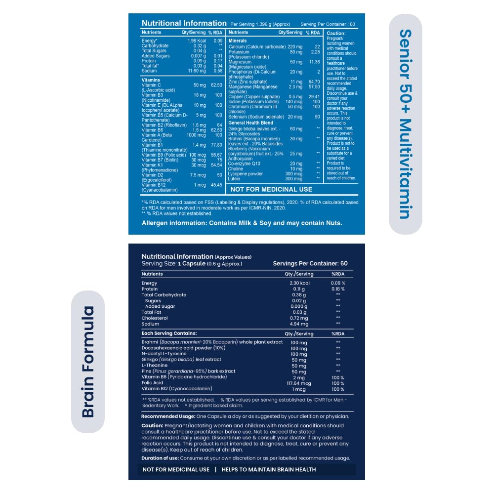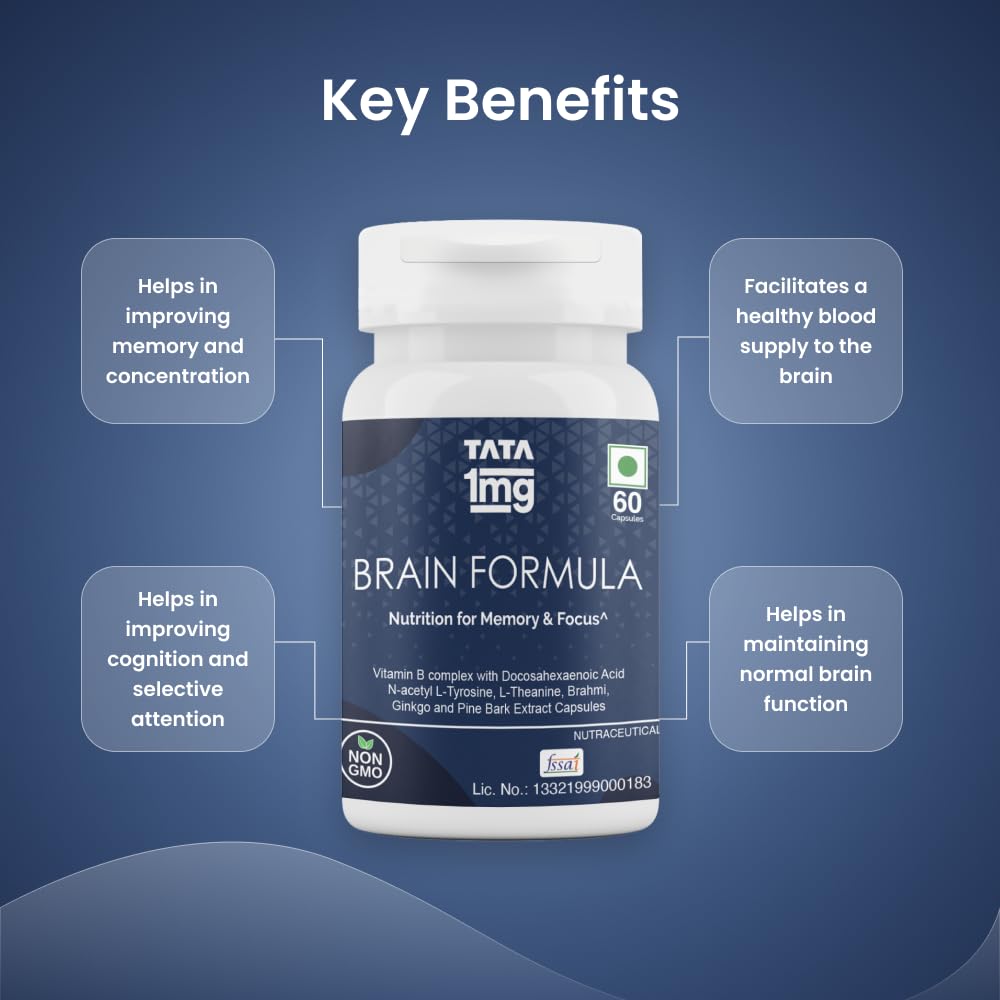Senior 50+ Multivitamin Tata 1mg Senior 50+ Multivitamin & Multimineral Veg Tablet is a health supplement that contains 24 essential vitamins and minerals to fulfil the need for micronutrients in older adults. It may improve the immune system and support overall health. General health blend may enhance memory prevent ageing and support eye and heart health. Brain Formula Tata 1mg Brain Formula with Vitamin B Complex L-Tyrosine L-Theanine Brahmi Ginkgo and Pine Bark Extract Capsule is formulated with beneficial ingredients for the growth and development of the brain. It acts as nutrition for memory and focus. It can help stimulate the brain's functioning to improve memory and concentration.