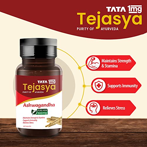 Tata 1mg Tejasya Ashwagandha Capsule 500mg, Supports Strength & Stamina, 500mg, Pack of 60 Capsules
