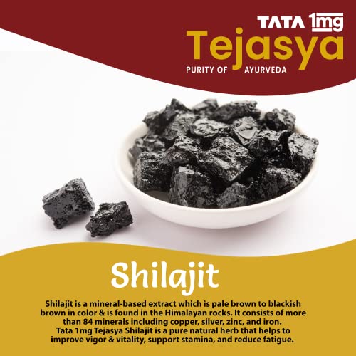 Tata 1mg Tejasya Shilajit Capsule is a purely natural herb that may help to improve vigour and vitality support stamina and reduce fatigue. Shilajit is a mineral-based extract which is pale brown to blackish brown in colour and is found in the Himalayan rocks. It consists of more than 84 minerals including copper silver zinc and iron. Tata 1mg Tejasya shilajit is made with pure natural Shilajit extract.