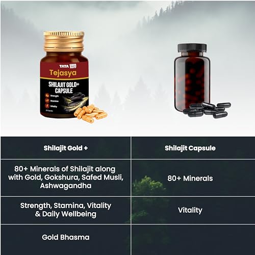 Tata 1mg Tejasya Shilajit Gold+ Capsule brings the goodness of ayurvedic traditional therapy with Shilajit and Swarn Bhasma as its key ingredients. Shilajit sourced from the Greater Himalayas consists of more than 84 minerals. It is a health rejuvenator that helps improve energy levels. Swarna Bhasma offers added benefits of maintaining immunity. The product enhances vitality maintains energy levels reduces weakness supports overall health and provides a sense of well-being naturally and effectively.