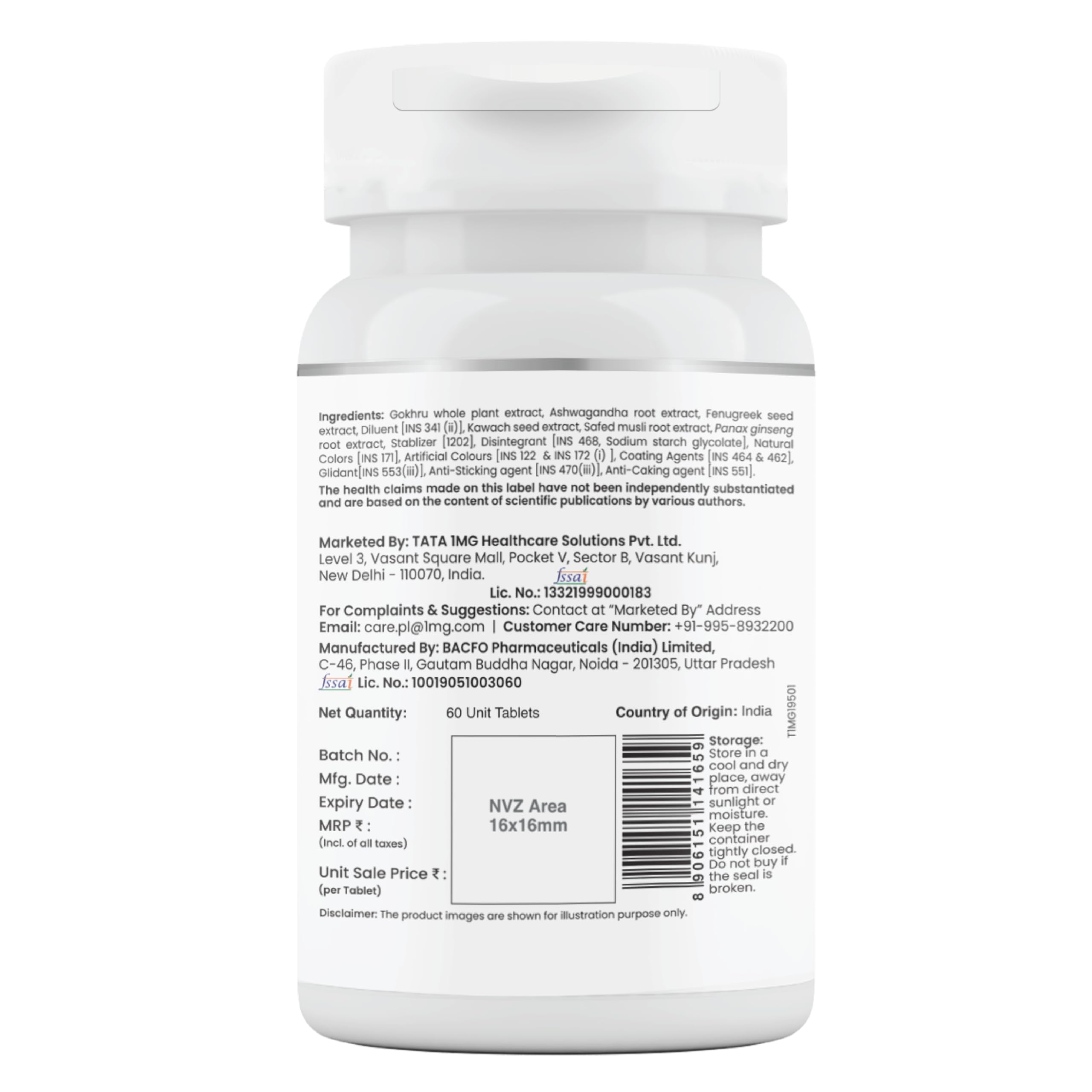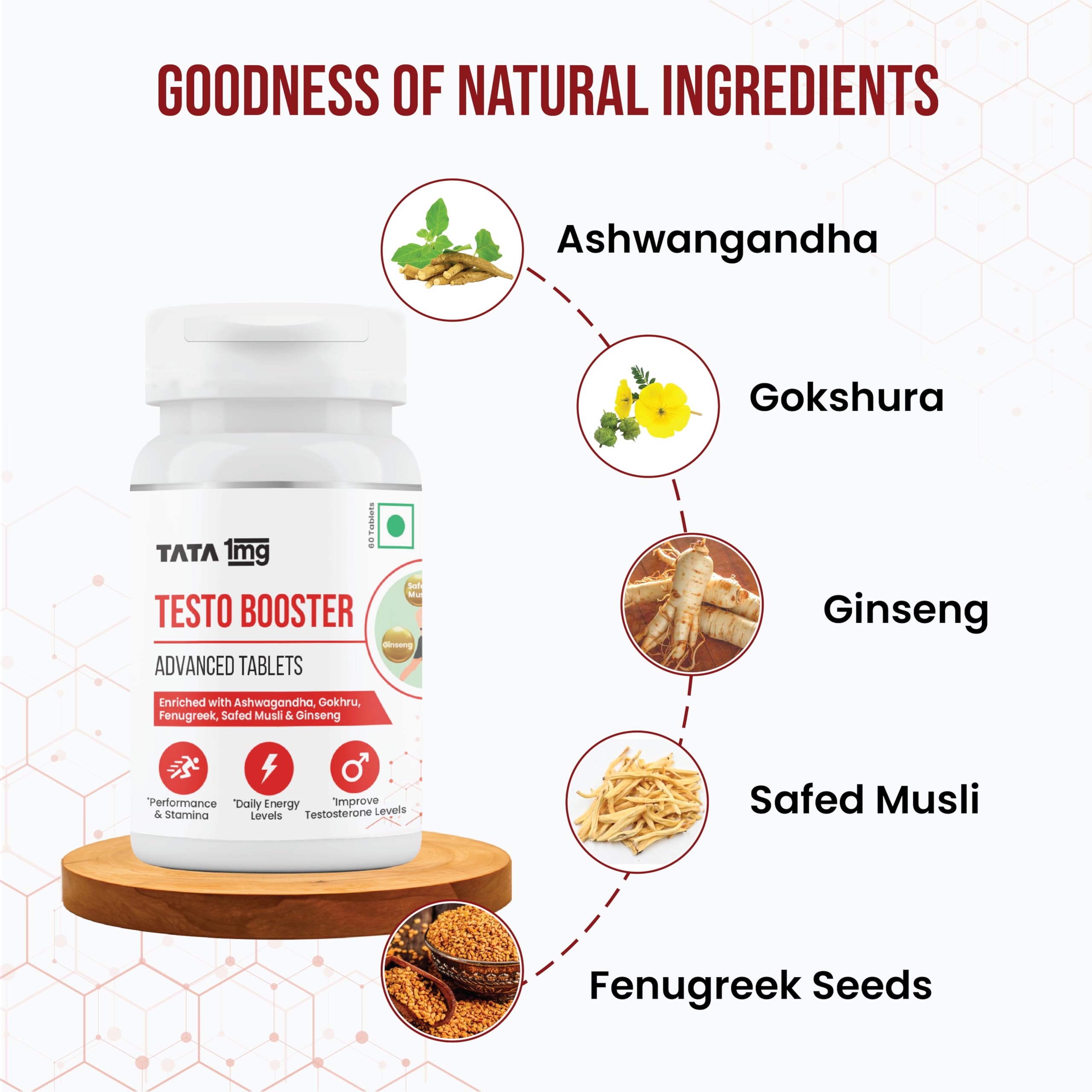 Tata 1mg Testo Booster is packed with natural ingredients that may help boost the testosterone level for overall health well-being and vitality. The goodness of Ashwagandha Gokhru Fenugreek Safed Musli Ginseng and Kawach extract promotes performance energy levels and stamina.