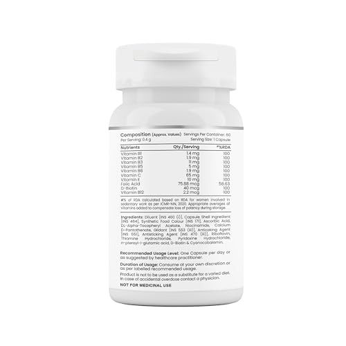 HomeHealth & PersonalDiet & NutritionHealth SupplementsTata 1mg Vitamin B Complex Capsules with 100% RDA for B1,B2,B3,B5,B6,Biotin, with Vitamin C and E, Helps Maintain Energy, Immunity and Skin Health, For Women & Men, Pack of 60 Vegetarian Capsules