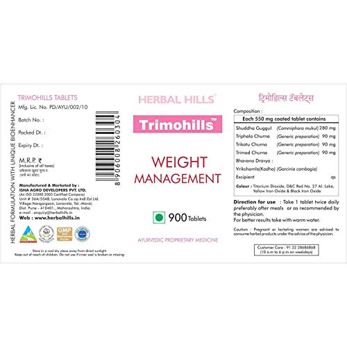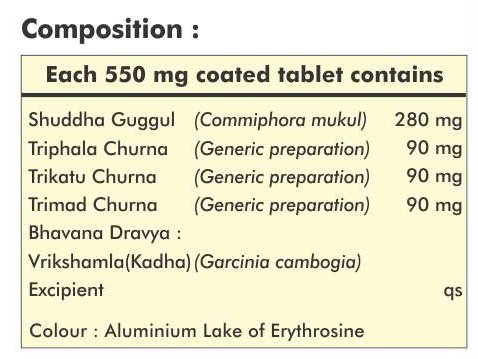 Ingredients: each film coated tablet contains triphala churna 90mg trikatu churna 90mg trimad churna 90mg shuddha guggul 280mg bhavana dravya vrikshamla kadha. Excipientsmagnesium stearate starch silicon dioxide xanthan gum color coat.