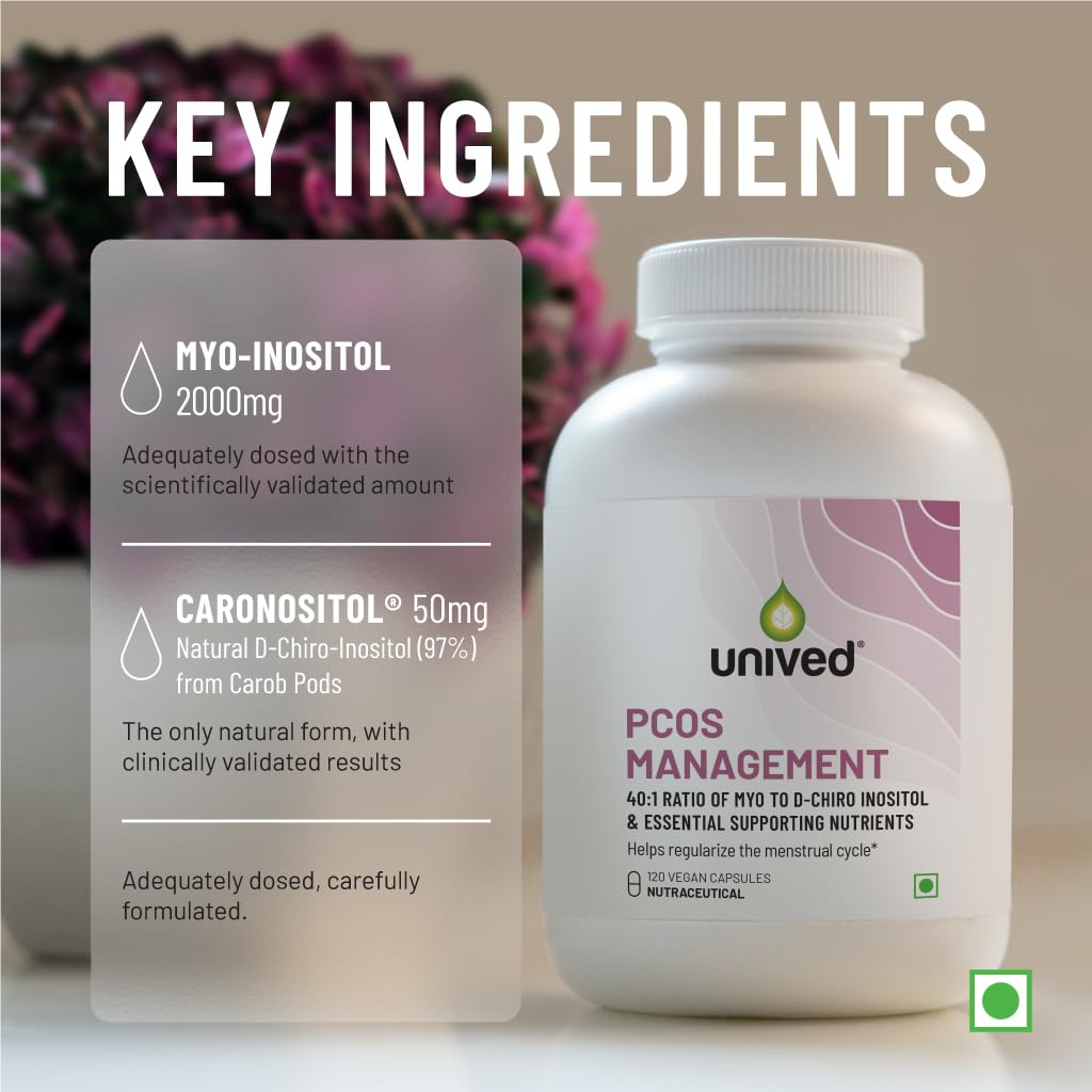 Unived PCOS Management 40:1 Ratio 2000mg Myo-Inositol to 50mg D-Chiro-Inositol with Natural Caronisitol for Acne Facial Hair Insulin Resistance (1 Month Supply capsules)