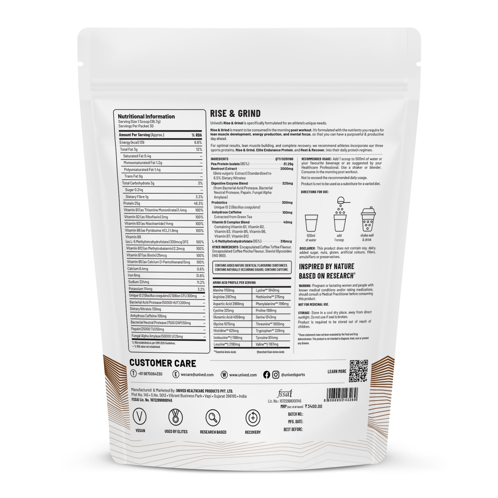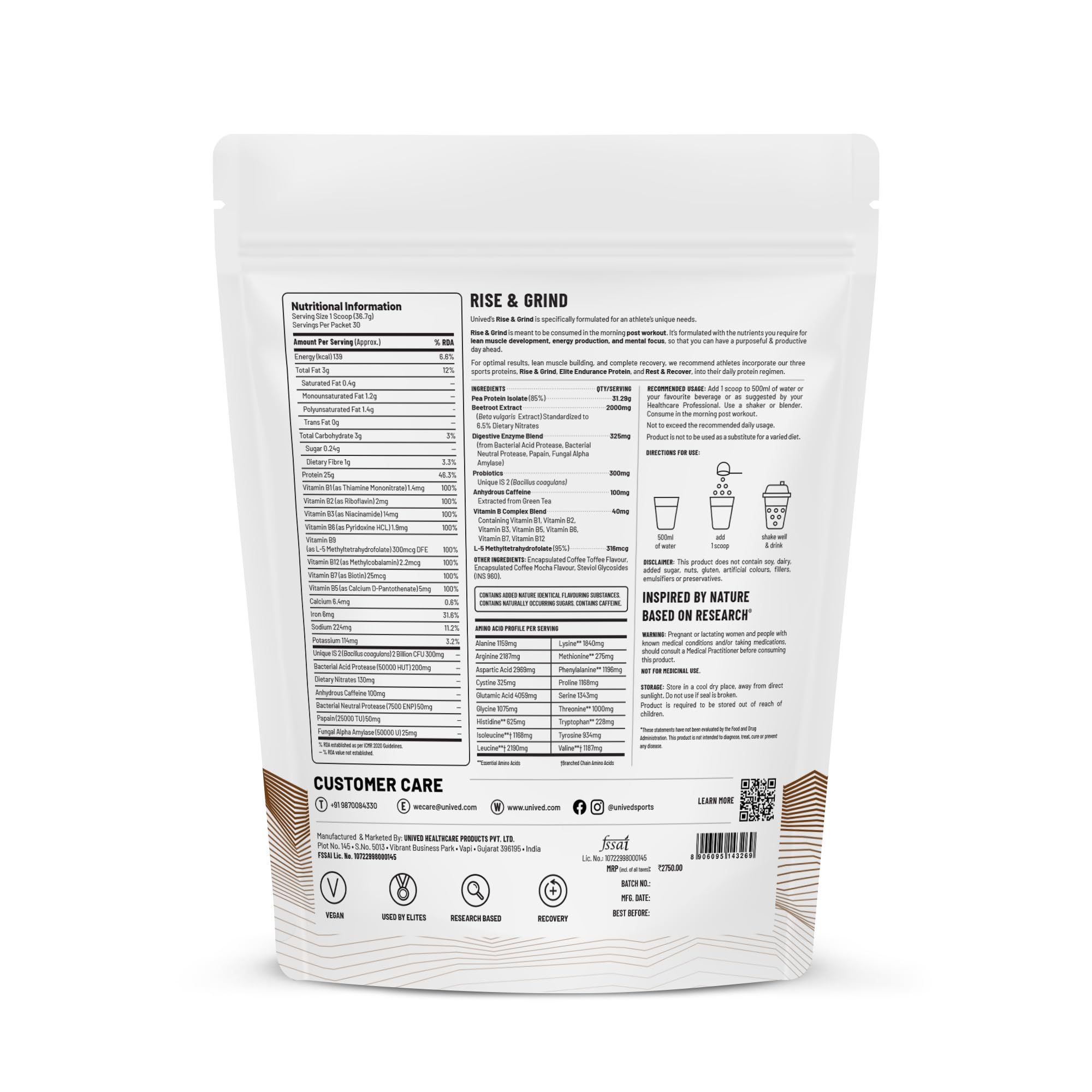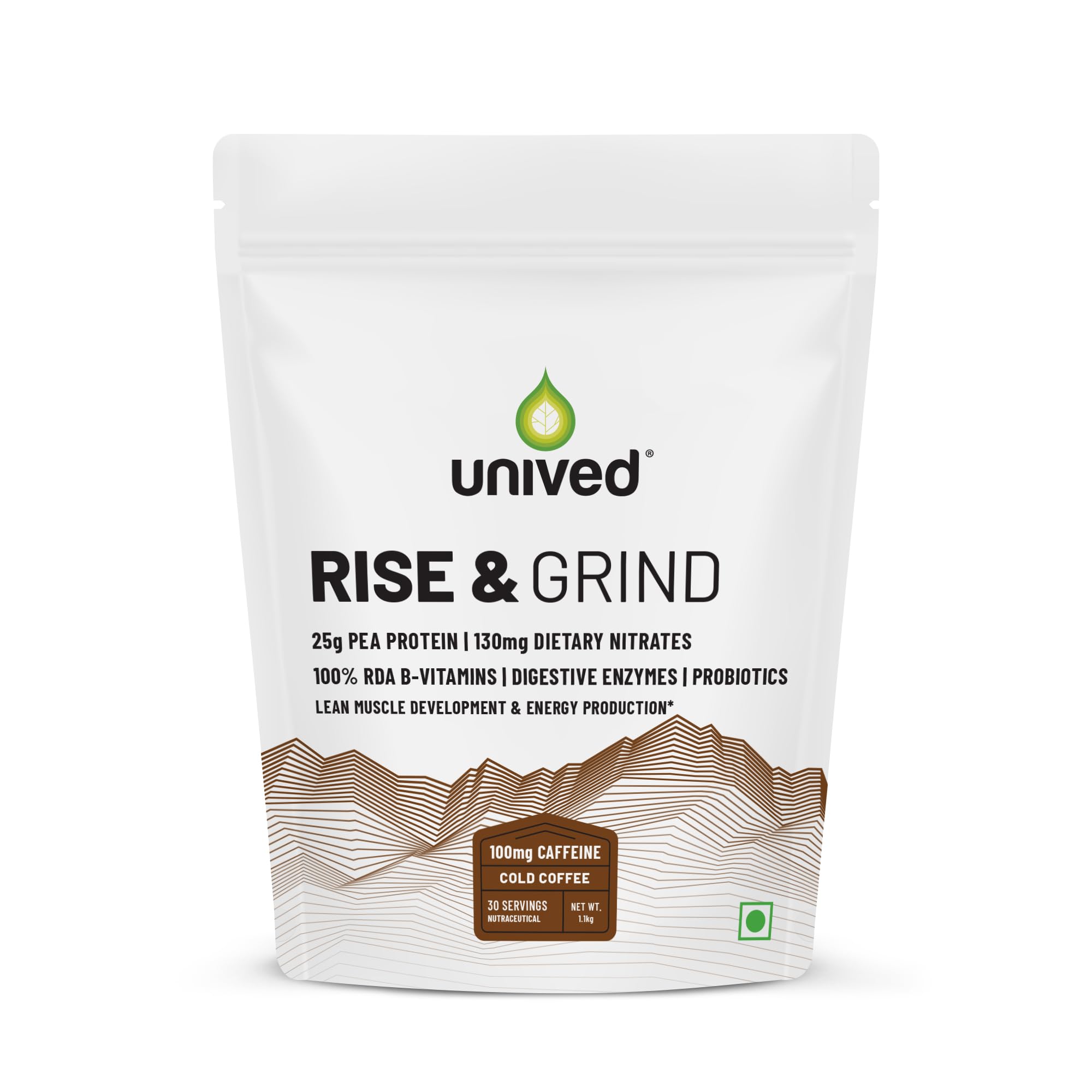 Unived Rise & Grind is a vegan protein supplement formulated with plant based pea protein. It is free of soy gluten dairy and cholesterol is non-GMO hypoallergenic and certified organic. Each serving offers 25g of pure pea protein isolate and 4.5g of natural occurring BCAAs with 130mg Dietary nitrates 100% RDA of all B-vitamins caffeineprobiotic & digestive enzymes