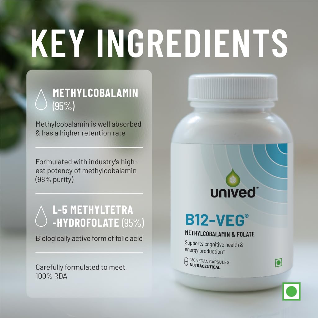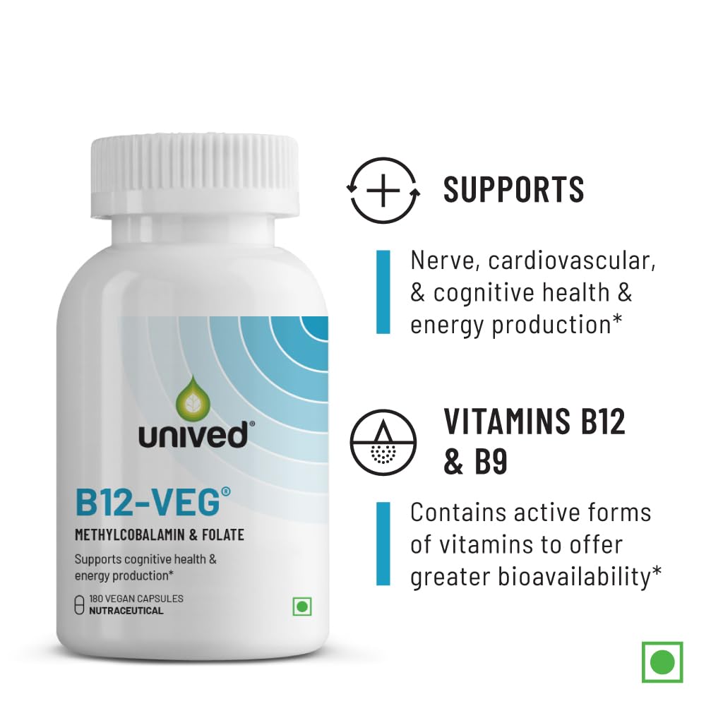 Unived Vitamin B12 Veg Methylcobalamin (98%) with Methyltetrahydrofolate (5-MTHF) Brain Cells & Nerve Tissue Support 180 Capsules