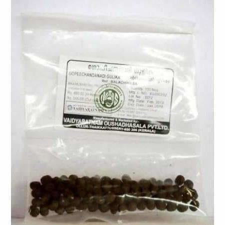 Vaidyaratnam Gopeechandanadi Gulika, For Paediatric Issues, 100% Herbal, 100 CapsulesVaidyaratnam Gopeechandanadi Gulika is an Ayurvedic formulation. This herbal decoction is traditionally used in India for pediatric issues.Form: CapsulesIdeal for: ChildrenType: Herbal supplementGender: Both men and womenPackage content: 100 capsules in an air-sealed pouchIngredientsVaidyaratnam Gopeechandanadi Gulika is an all-natural decoction. It is made withSugarCloveShiralCeleryOnionColeusKurchiGingerVetiverNutmegVidangaTurmericNutgrassRock saltChampakCinnamonChina rootSweet flagRudrakshaMyrobalanAsafoetidaCardamomAleppo oakCaperberryLong pepperCarom seedsBlack pepperIndian kudzuFennel seedsLicorice rootCitrus lemonMexican mintTailed pepperFennel flowerGreen chirettaWhite turmericBlack oil plantAutumn crocusGreater galangalHimalayan cedarCeylon ironwoodIndian moonseedMount atlas daisyIndian gooseberryBeleric myrobalanIndian sarsaparillaIndian elecampaneCommon grapevineBenefitsVaidyaratnam Gopeechandanadi Gulika may help the user in the following health issues.FeverCough and coldFeaturesVaidyaratnam Oushadhasala was founded in 1941. The institute is located at Ollur, Kerala. It is known for the wide range of herbal supplements. Vaidyaratnam Gopeechandanadi GulikaIs 100% herbalIs made with the best quality ingredientsComes with a long shelf life of 12 months from the date of manufactureDoseVaidyaratnam Gopeechandanadi Gulika should be consumed after consulting an Ayurvedic physician. Generally, the below steps are followed to have the decoction.Take 1-2 capsules a dayHave the decoction twice a dayTake the supplement with lukewarm waterYou can take cumin powder as an adjuvant with the supplementTipsVaidyaratnam Gopeechandanadi Gulika stays fresh and usable for long if the below tips are followed.Store at a cool and dry placeWarningKeep away from childrenDo not e