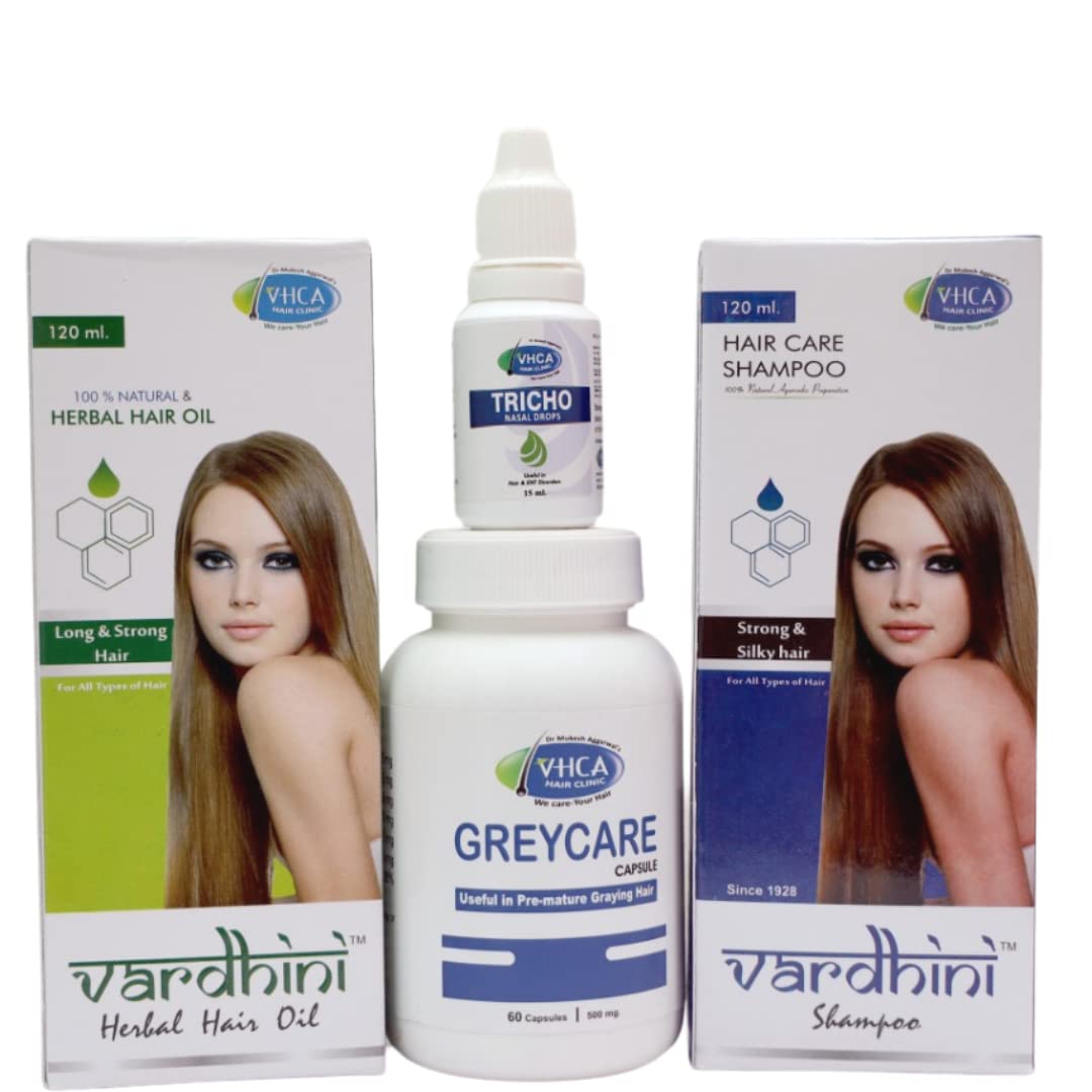 VHCA Combo of 4 Greycare Capsules Tricho Nasal Drops Vardhini Oil and Vardhini Shampoo is for Pre-mature Greying hairs. By using this for 1 month on daily basis you will get results.