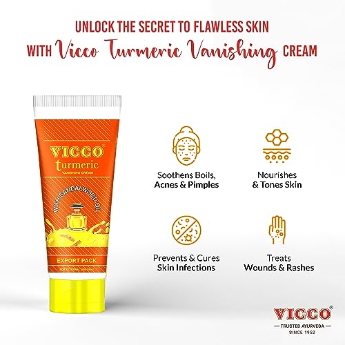 • Vicco Turmeric Vanishing Cream: Vicco has added the science of Ayurveda to cosmetics after decades of research. Vicco Turmeric Vanishing Cream is an Ayurvedic skincare product rich with the benefits of turmeric sandalwood oil and other natural components.