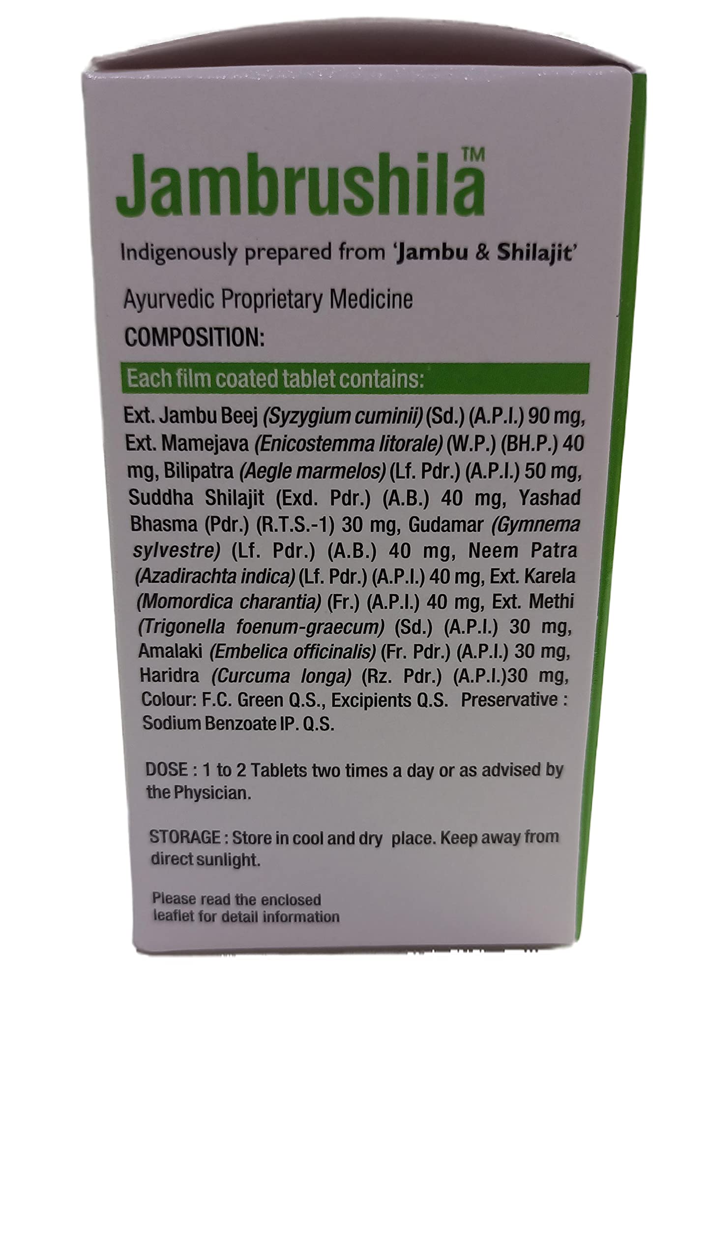 Jambrushila is the excellent combination of the Ayurvedic oral Hypoglycaemic components. Jambrushila can be helpful to treat all stages of the Hyperglycaemia.