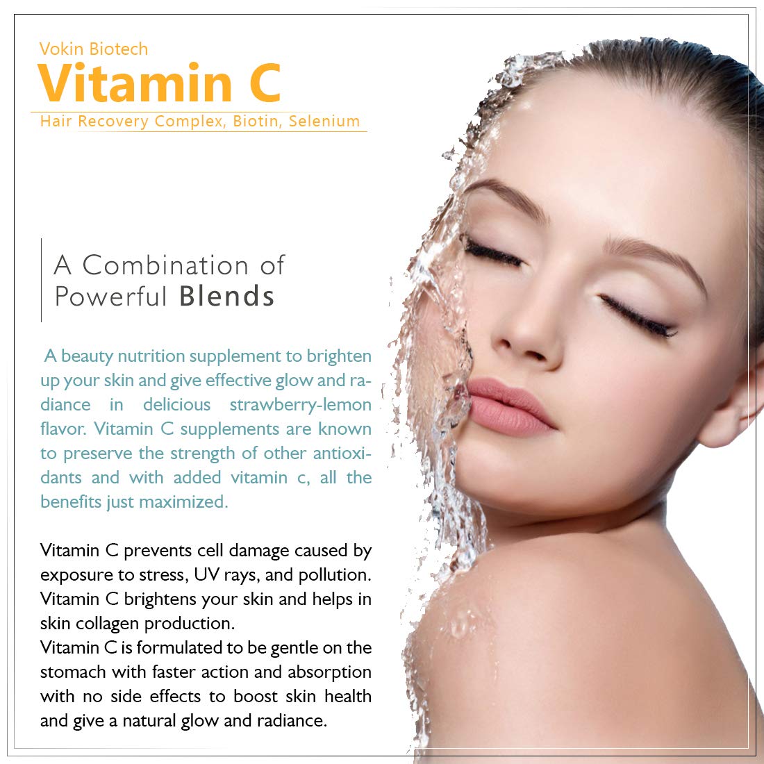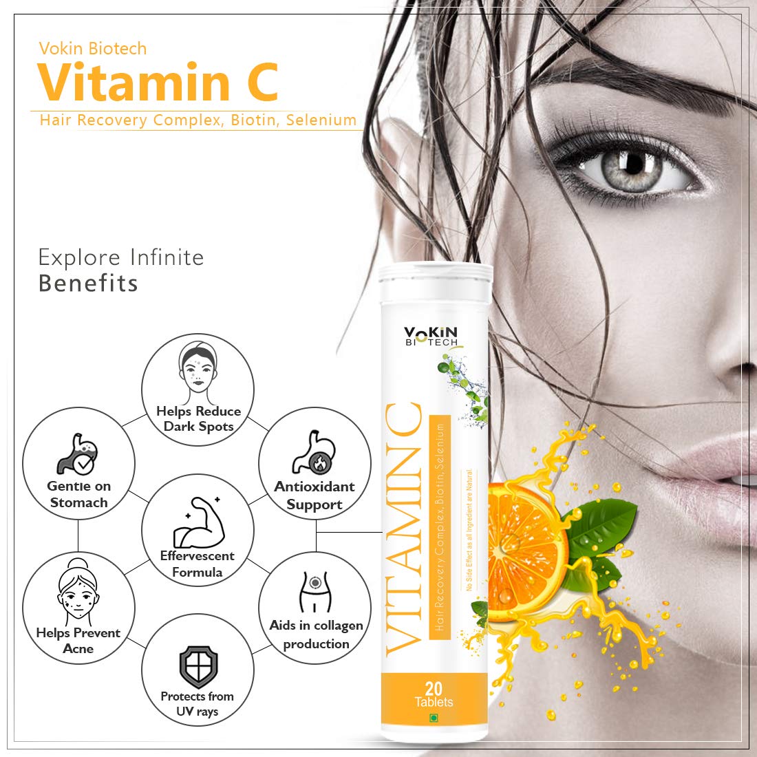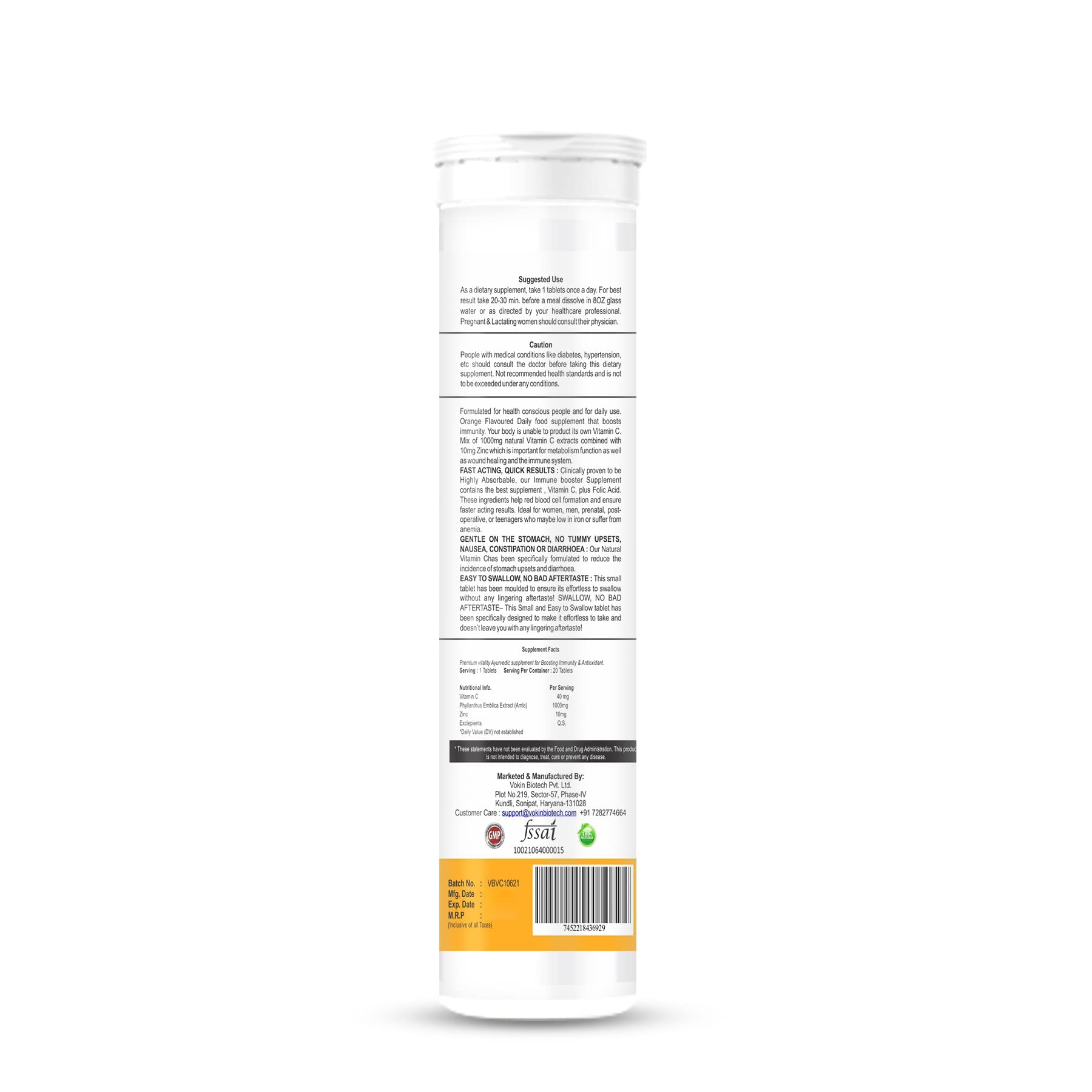 Dual action of vitamin c and zinc : Vokin Biotech has the dual power of 1000mg Phyllanthus Emblica Extract (Amla) and 10mg Zinc. Vitamin C with Zinc is better absorbed in body. It provides powerful antioxidant protection. Helps to maintain normal immune s