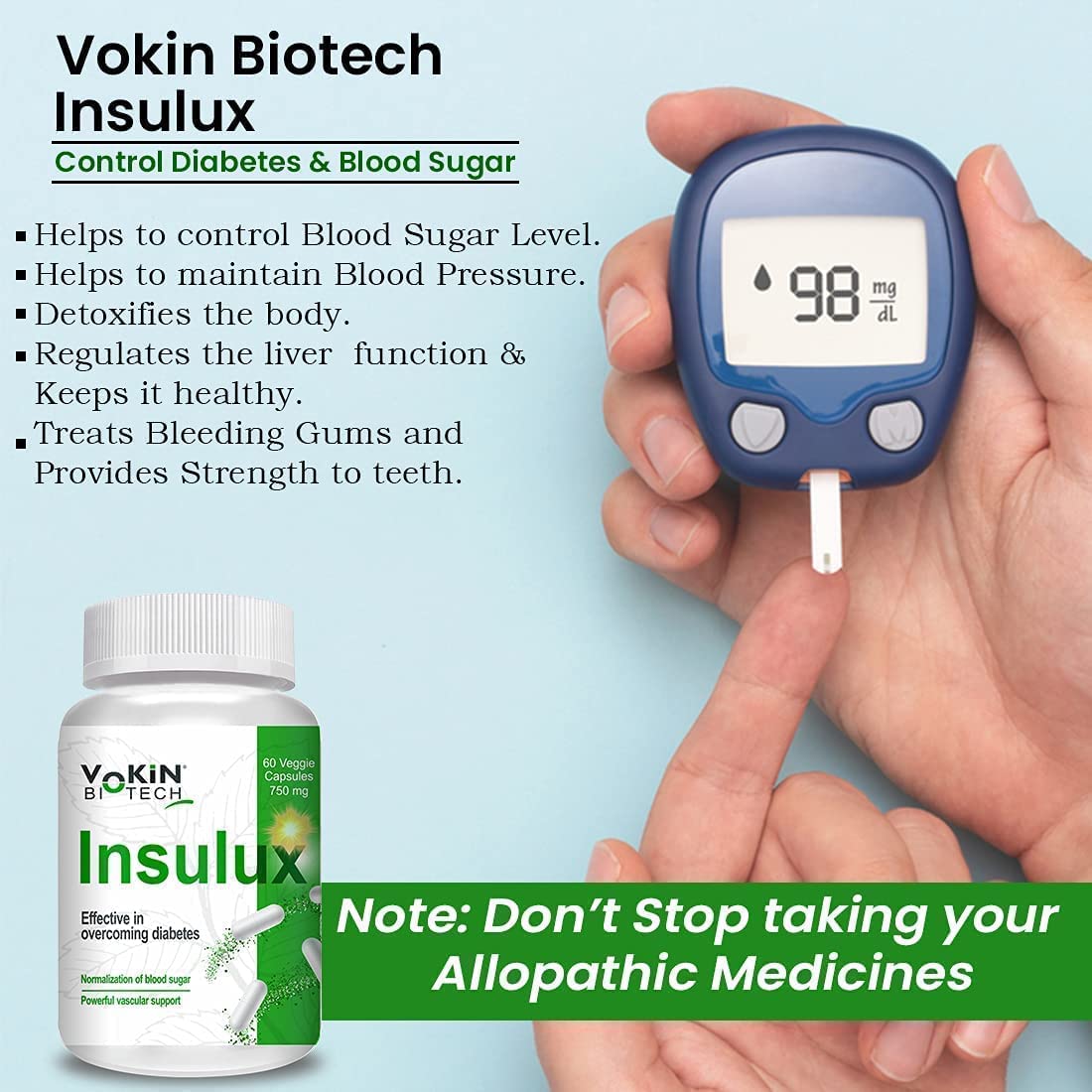 Vokin Biotech Herbal Insulux Gymnema Sylvestre for Diabetes Control 750mg 60 Capsules Helps in Boosting Endocrine System Blood Sugar for Men & Women will help you maintain healthy blood sugar levels and improve your overall health and well-being. CardioVax is a health supplement which is popular for helping people to fight against heart failure stroke and high blood pressure. CardioVax Tablets acts very quickly and help to normalize blood pressure and irregular heartbeat It helps to fight from existing problems and also prevents any future mishapOur vegetarian-friendly tablets are packed with 750mg of Gymnema Sylvestre a powerful Ayurvedic herb known for its ability to support pancreatic cells reduce intestinal glucose absorption and may help in enhance vitality and energy. Additionally Gymnema Sylvestre may help support normal lipid metabolism and control diabetes. Daily Exercise including more fruits and vegetables in your diet can further help to regulate your blood sugar levels and reduce the risk of diabetes-related complications. Make sure to talk to your doctor before starting any new supplement routine.