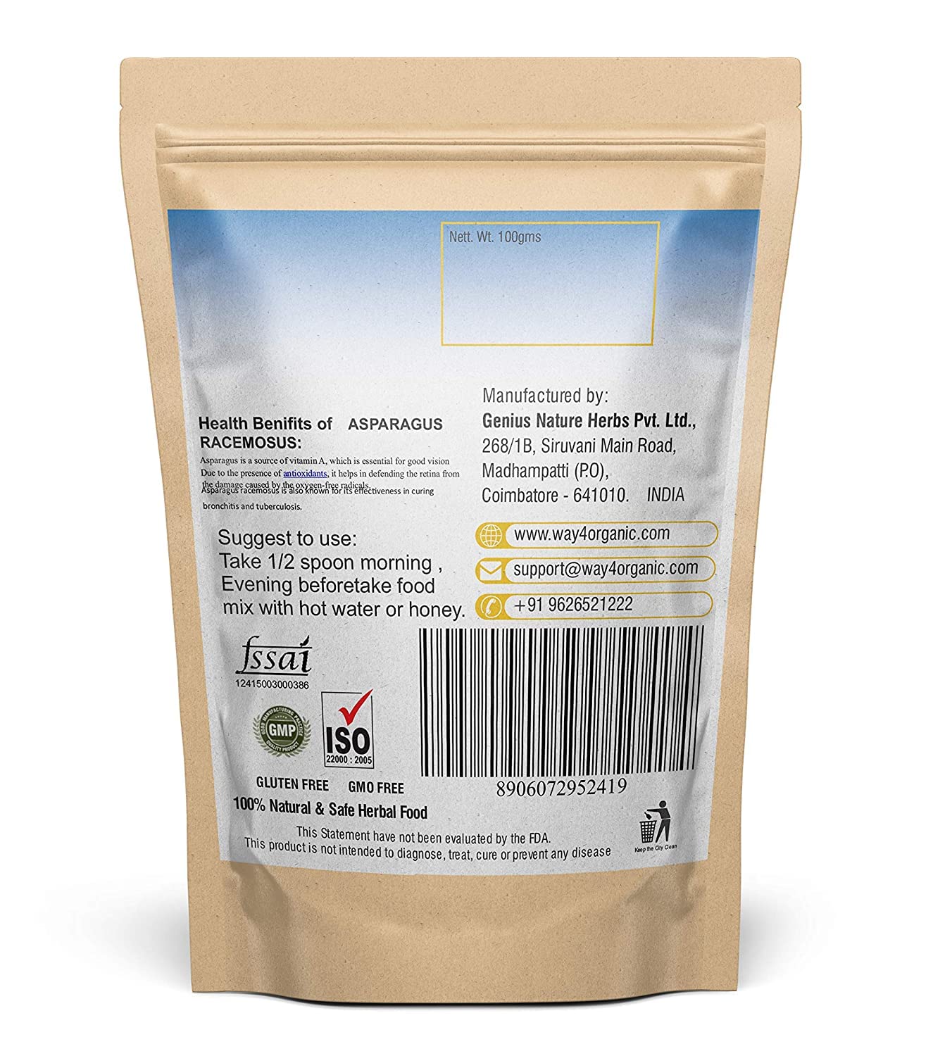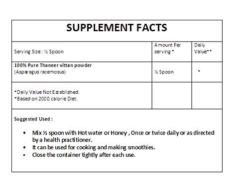 Quantity: 100g Item Form: Powder Package content includes 1 pure asparagus racemosus raw powder This raw powder enhances overall health immune system and is basically used for anti aging purpose 100% Natural and safe herbal food