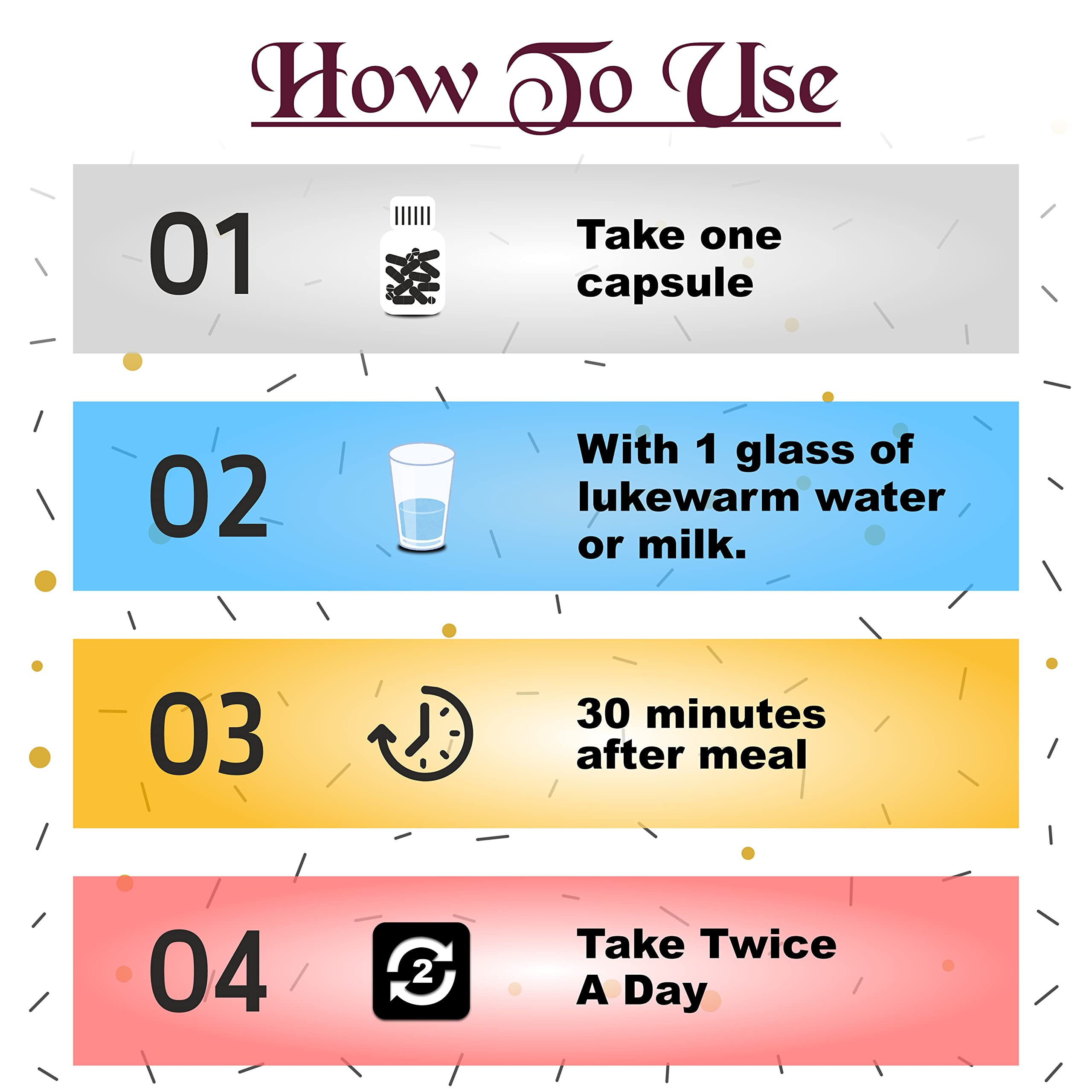 • Take two capsule in a day with lukewarm milk or water after meal one in evening and one in morning.