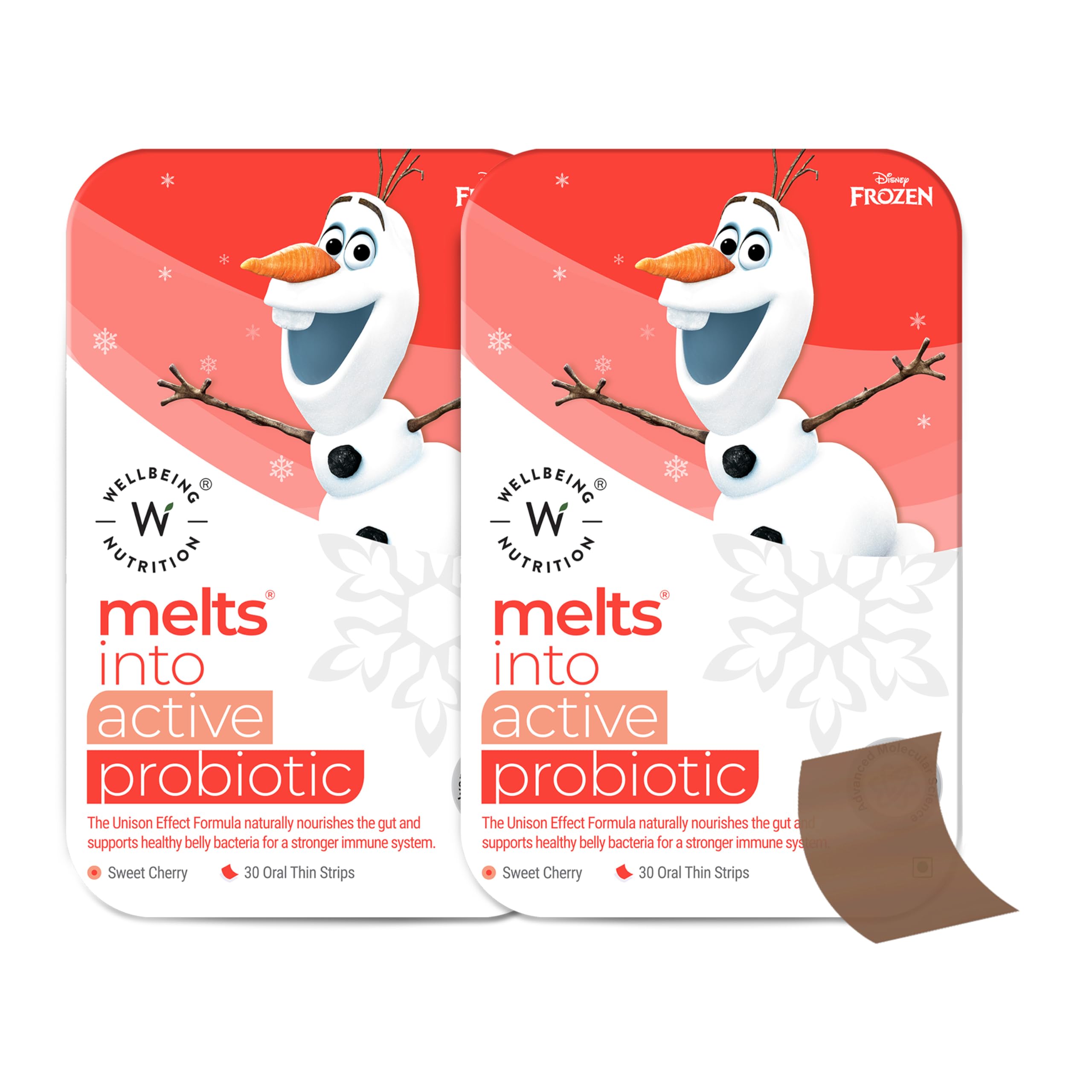Wellbeing Nutrition Frozen Olaf Melts | Active Probiotics & Prebiotics for Kids (6+) to Improve Digestion, Immunity & Gut Health | Kids Health Supplement | Sweet Cherry Flavor (60 Oral Strips)