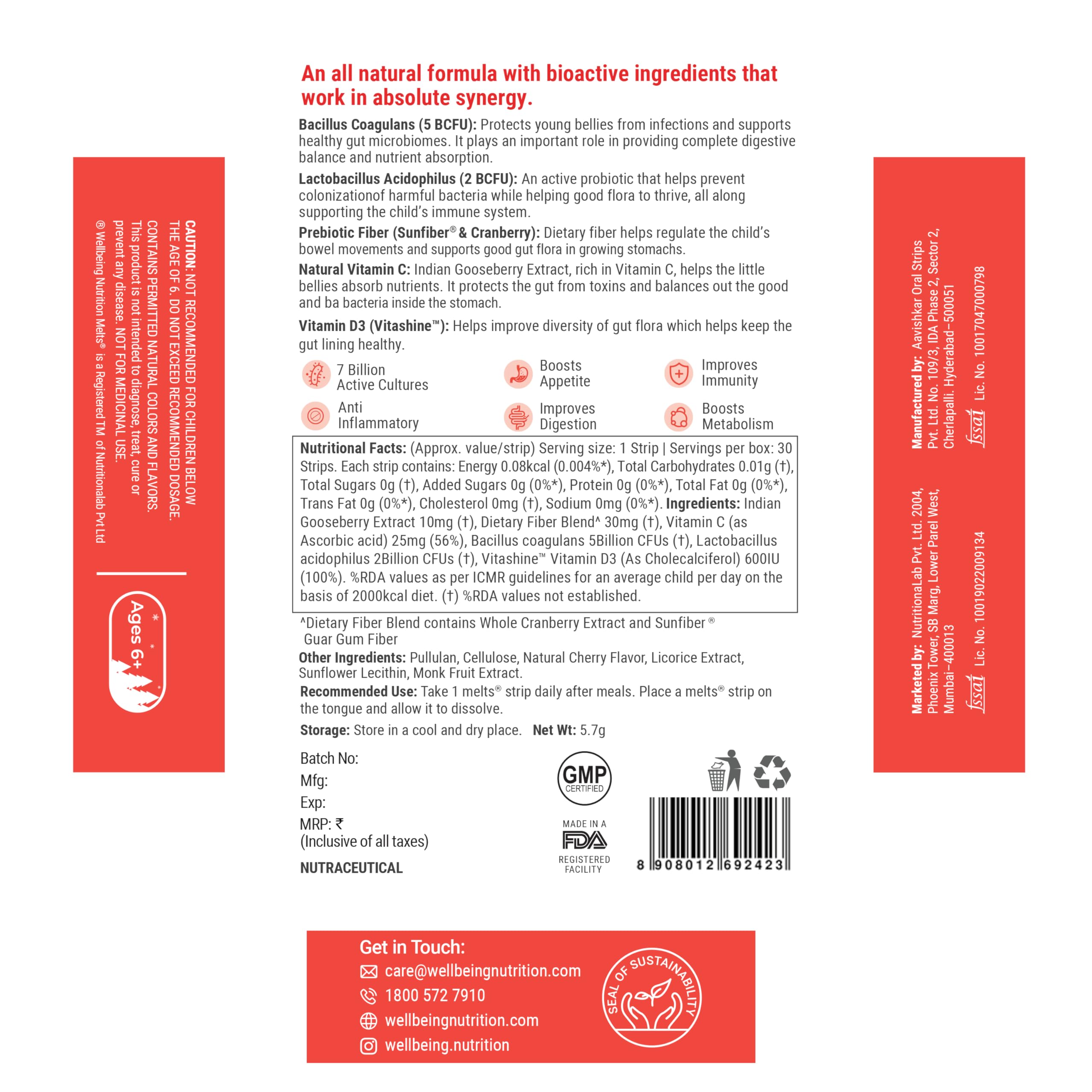 • COMPLETE DIGESTIVE HEALTH SUPPORT: Probiotics are clinically proven to boost metabolism and support the digestive system. With 7 billion CFU of active live cultures these melts consists of Bacillus Coagulans which protects the young bellies from infection
