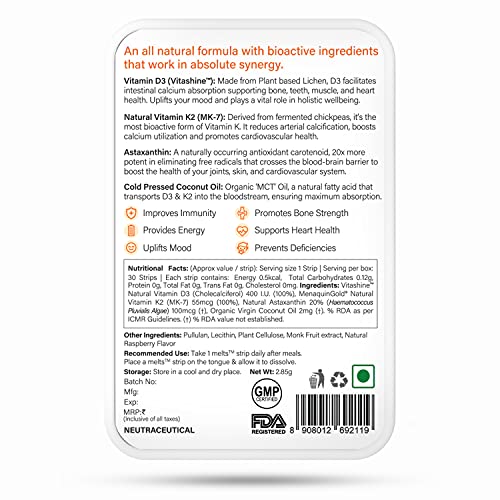 Wellbeing Nutrition Melts Natural Vitamin D3 from Plant Based from Chickpeas Astaxanthin from Algae and Organic Cold Pressed Virgin Coconut oil helps you to naturally revitalize with the ‘Sunshine Vitamin' essential for daily upkeep. Melts Nano oral strips are clinically proven and 100% bioactive using patented German Nano Technology to boost skeletal muscle development prevent chronic diseases improve cell function strengthen the neuromuscular system and increase calcium absorption healthy immune system and has been linked with lower levels of depression. Made using Advanced clinically studied ingredients Melts Plant Based promotes Strong Bones Helathy Teeth Muscle Function Helps Regulate metabolism Supports Cardiovascular function and Heart Health Reduce inflammation Anti Oxidant support and Energy.