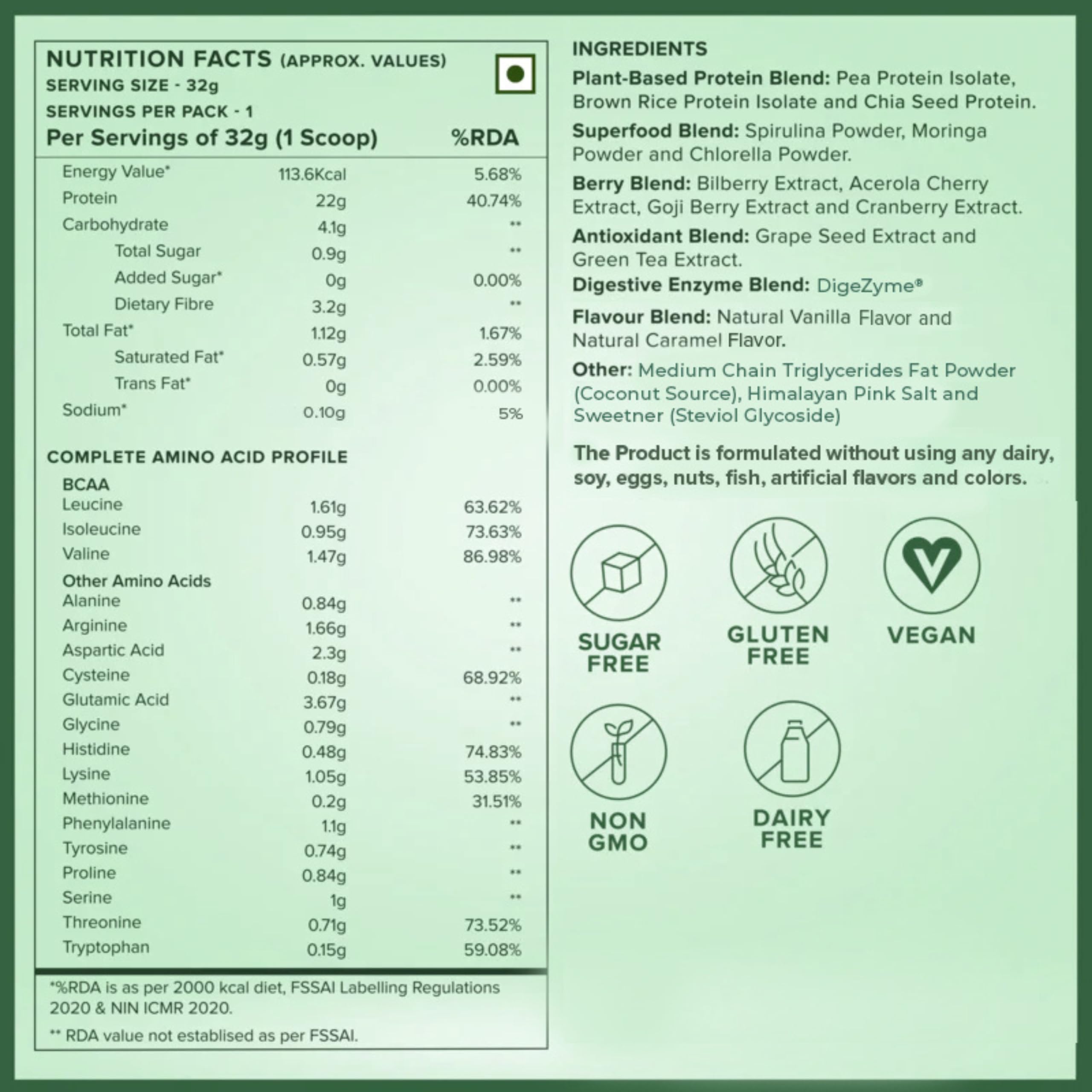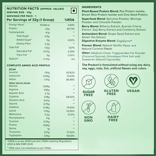 • SUPERIOR PROTEIN FOR MUSCLE GROWTH & REPAIR : With 22 grams of pure protein sourced from European Pea Protein Isolate Brown Rice Protein Isolate and Chia Seeds this plant protein is an excellent post workout companion with a complete amino acid profile th