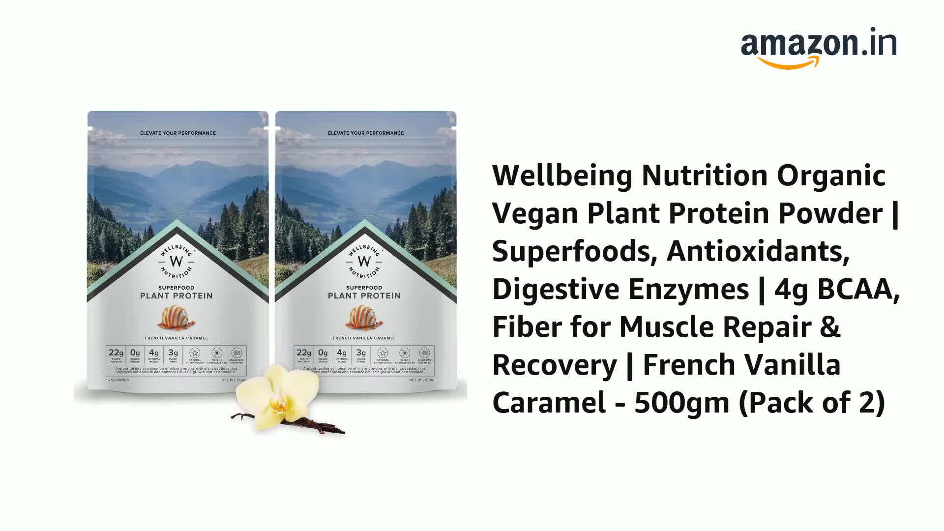 Wellbeing Nutrition Organic Vegan Plant Protein Isolate Powder | 22g Protein, 5g BCAA | Complete Amino Acid Profile | Prebiotics & 3B CFU Probiotics | No Bloating | Easy to Digest | Trace Minerals & Alkalizing Greens | French Vanilla Caramel- 500gm