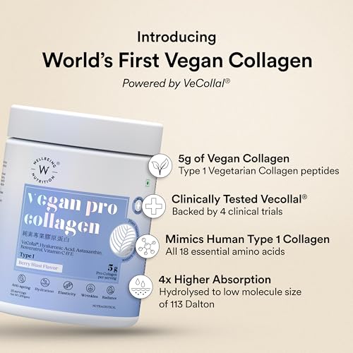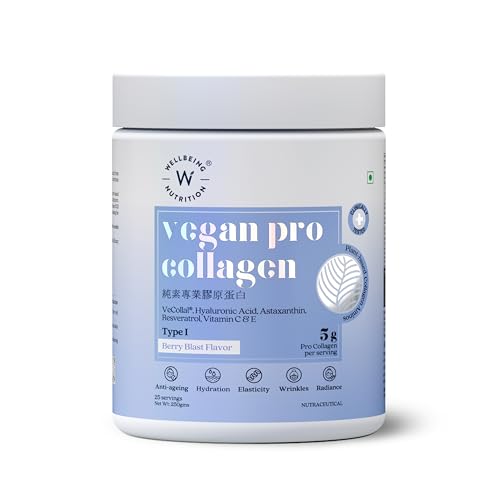 Wellbeing Nutrition Vegan Pro Collagen | Hyaluronic acid, Natural Astaxanthin, Resveratrol | Vitamin C | Boosts Collagen Production | Improves Skin Hydration, Texture & Evens Skin Tone | Berry Blast