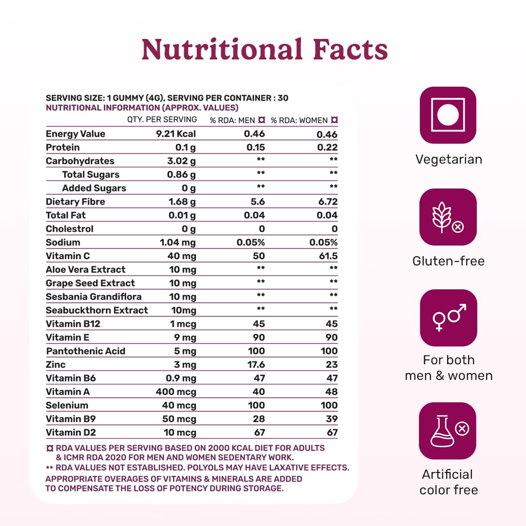 Expert Blend of Nutrition: These gummies are a combination of super nutrition which is just what you need for your skin hair & nails to glow and grow and maintain their structure. Contains the goodness of Biotin Sea Buckthorn Aloe Vera Folic Acid Grape Se