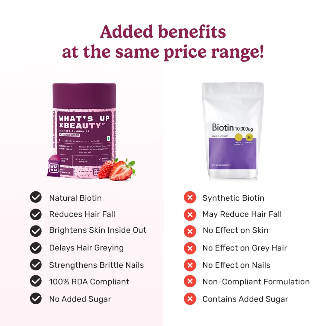 What's Up Wellness Beauty No Added Sugar Gummies: It is a delicious blend of essential nutrients to keep your skin hydrated and maintain its youthful glow. Superfood Sea Buckthorn fights the daily pollution & prevents breakouts while Aloe Vera helps in so
