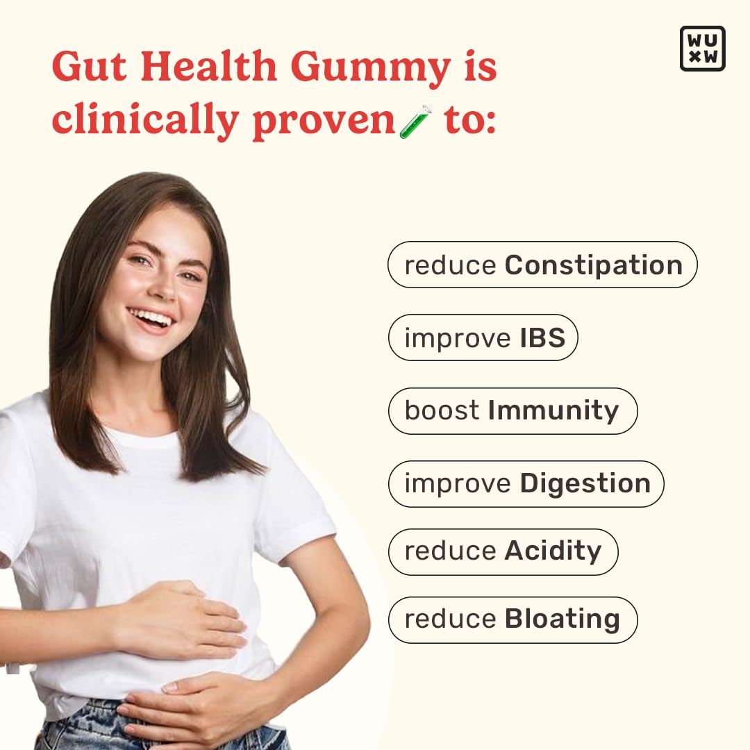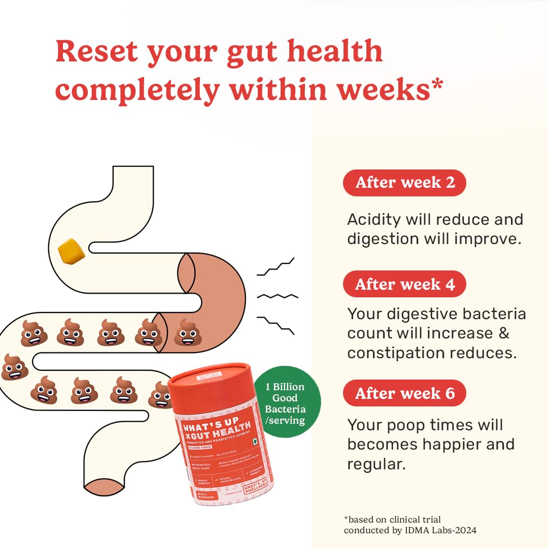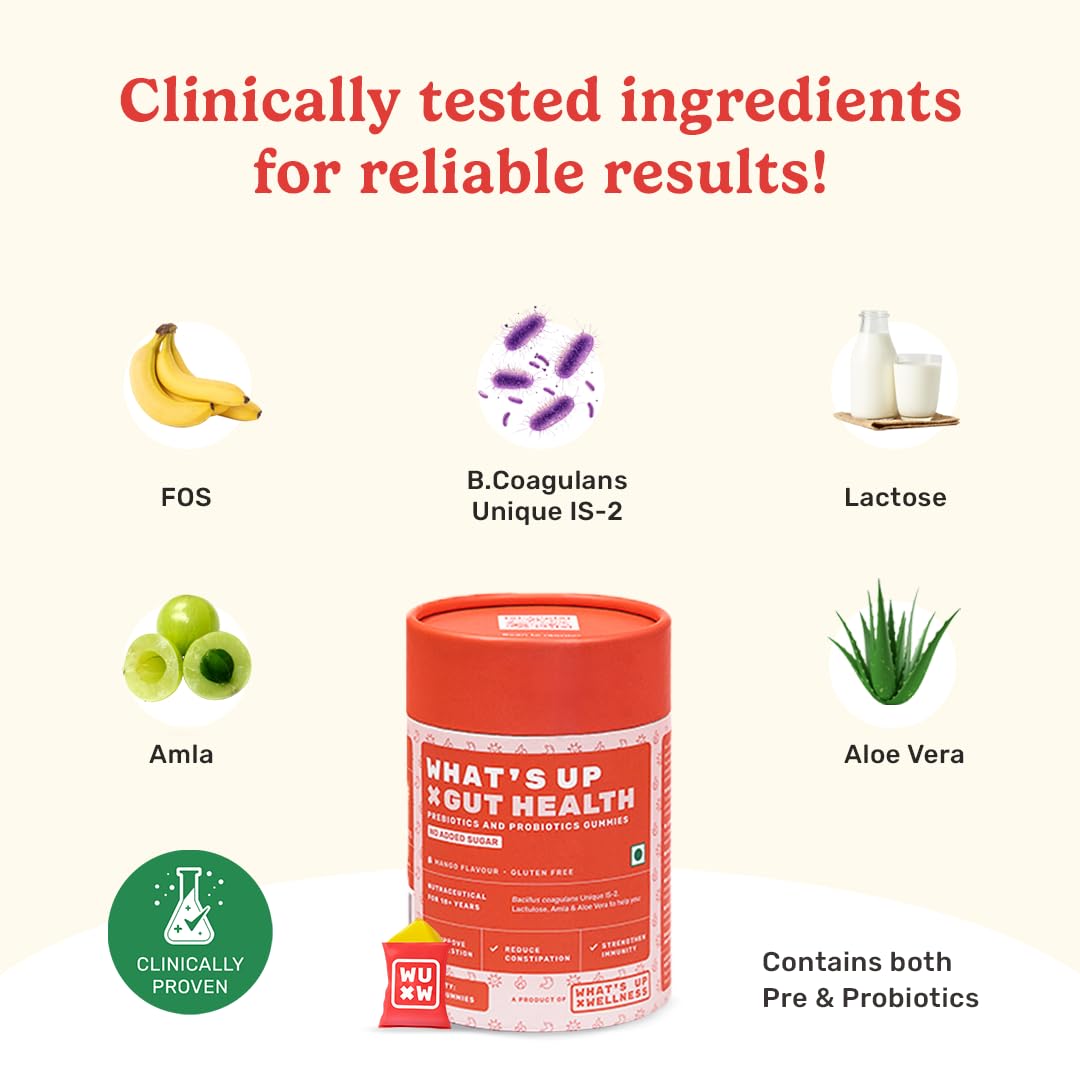 What's Up Wellness Gut Health Supplements Gummies | Prebiotics & Probiotics Supplement | Constipation Bloating Gas & Acidity Relief | Immunity | Clinically Proven Strain | 30 Days (Pack Of 1)