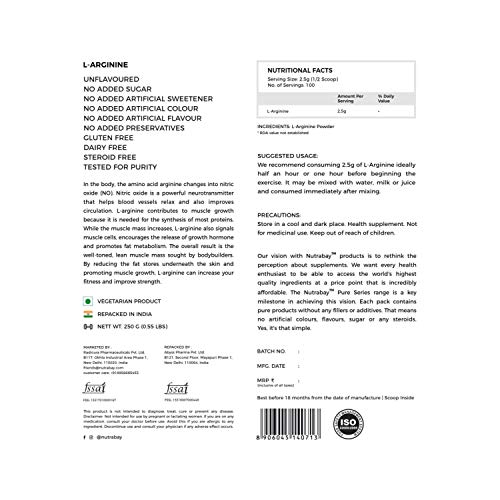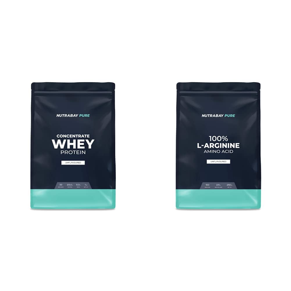 Nutrabay Whey Protein Concentrate (Unflavoured) - 1 kg | Raw Whey from USA | 33 servingsNutrabay Pure 100% Whey Protein Concentrate is designed to give you a rich protein source for building muscle and faster recovery. We use one of the highest quality ingredients available in the market to ensure that you get the best results. It's high protein content makes it the protein of choice.Nutrabay Pure 100% L-Arginine - Unflavoured 250gL-Arginine is an amino acid that changes into Nitric Oxide (NO) in the body. Nitric oxide is a powerful neurotransmitter that helps blood vessels relax and also improves circulation. It contributes to muscle growth because it is needed for the synthesis of most proteins. While the muscle mass increases it also signals muscle cells encourages the release of growth hormone and promotes fat metabolism. The overall result is the well-toned lean muscle mass sought by bodybuilders.