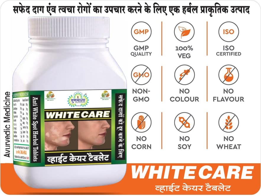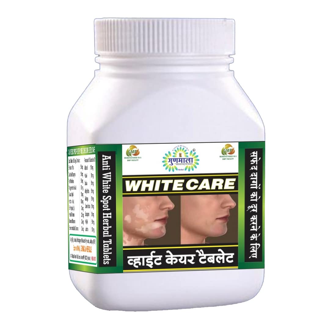 White Care Tablet Composition Each tablet 500 mg. Contains : Shivatrari R. 50 mg. Gandhak R. 50 mg. Ras Manikaya 50 mg. Arogyavardhani 50 mg. Bavachi 50 mg. Kattha 100 mg. Bhringaraj 75 mg. Kasis Bh. 25 mg. Tamara Bh. 25 mg. Swarnamakshik Bh. 25 mg. Processed In Decoction Of : Mehandi 150 mg. Kutaki 50 mg. Sariva 50 mg. Manjishtha 50 mg. Vidanga 50 mg. Daru Haridra 50 mg. Saptaparni 50 mg. Kalijiri 50 mg. Lodhra 50 mg.