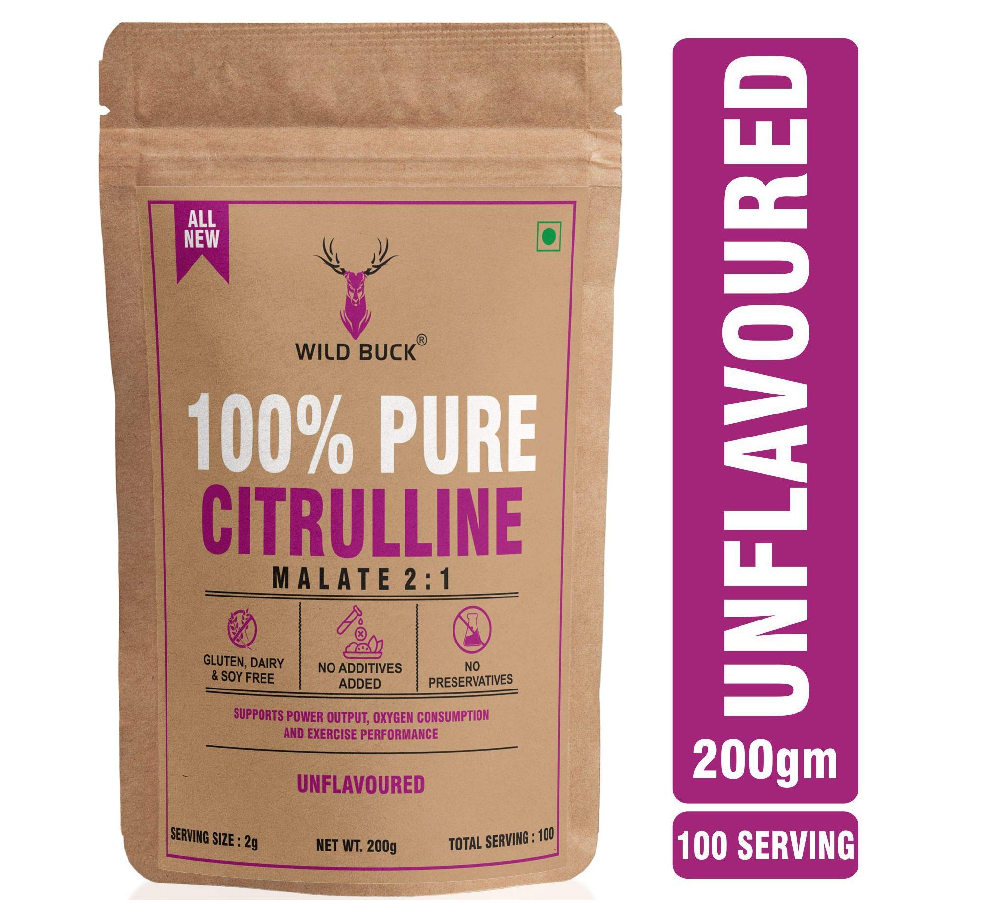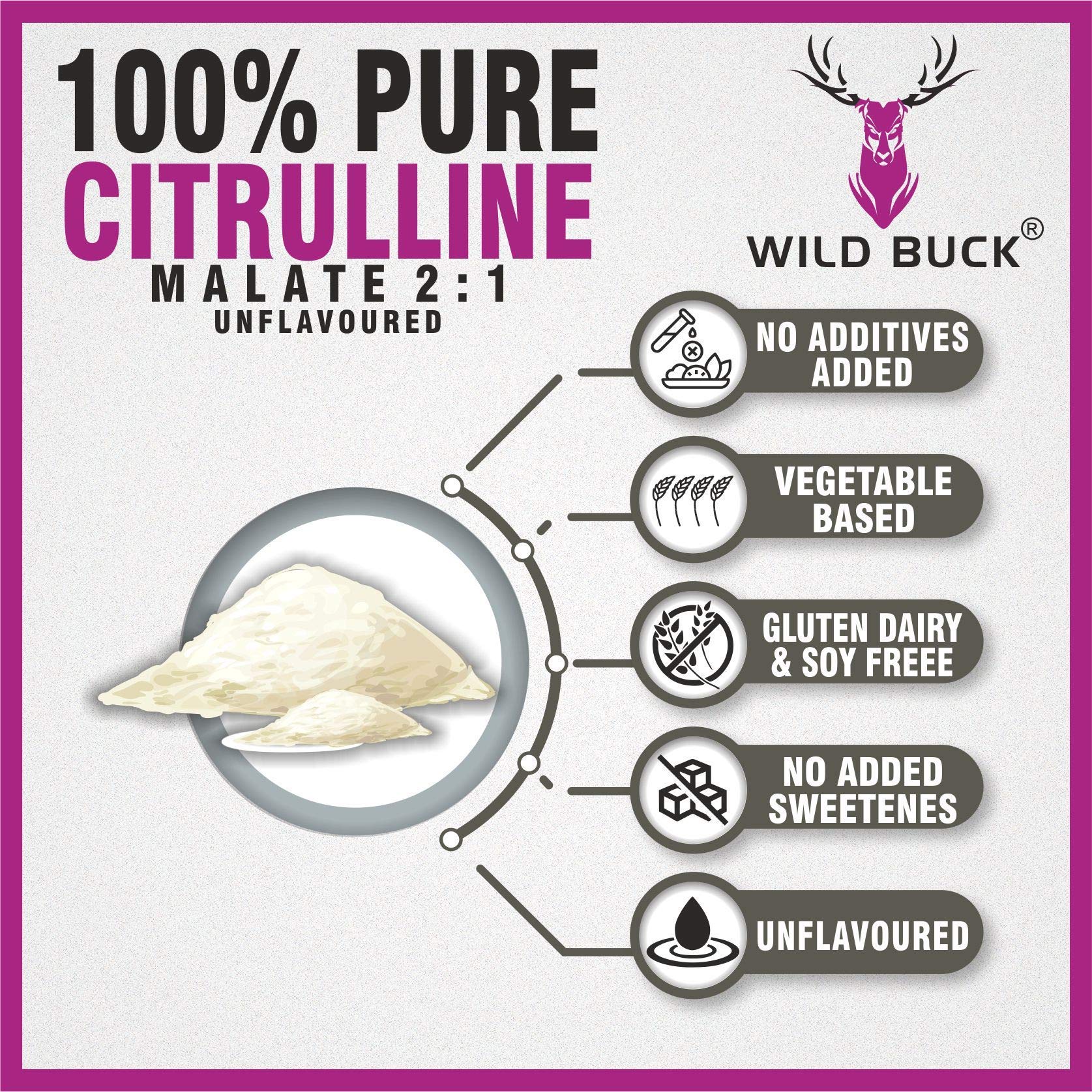 No pre-workout supplement stack is complete without Citrulline. It is every bodybuilderâs dream to have a perfectly chiseled physique with impressive pumps. Citrulline Malate helps bodybuilders fulfill their dream of having those perfect pumps. Citrulline Malate helps in increasing the concentration of arginine and eventually boosting the levels of Nitric Oxide. Nitric Oxide functions as a vasodilator which enhances the diameter of blood vessels boosting blood flow to the muscles that are involved in the workout. This helps in boosting the pump. It boosts the endurance and capacity of the workout by supplying more oxygen to the muscles. Citrulline Malate is a non-essential amino acid that helps in boosting the pump and enhancing your exercise performance. It also helps in building muscle endurance. To nourish your body with this amazing nutrient Wild Buck has formulated Wild Buck Citrulline Malate that offers you 2g of this special nutrient to enhance your pump.