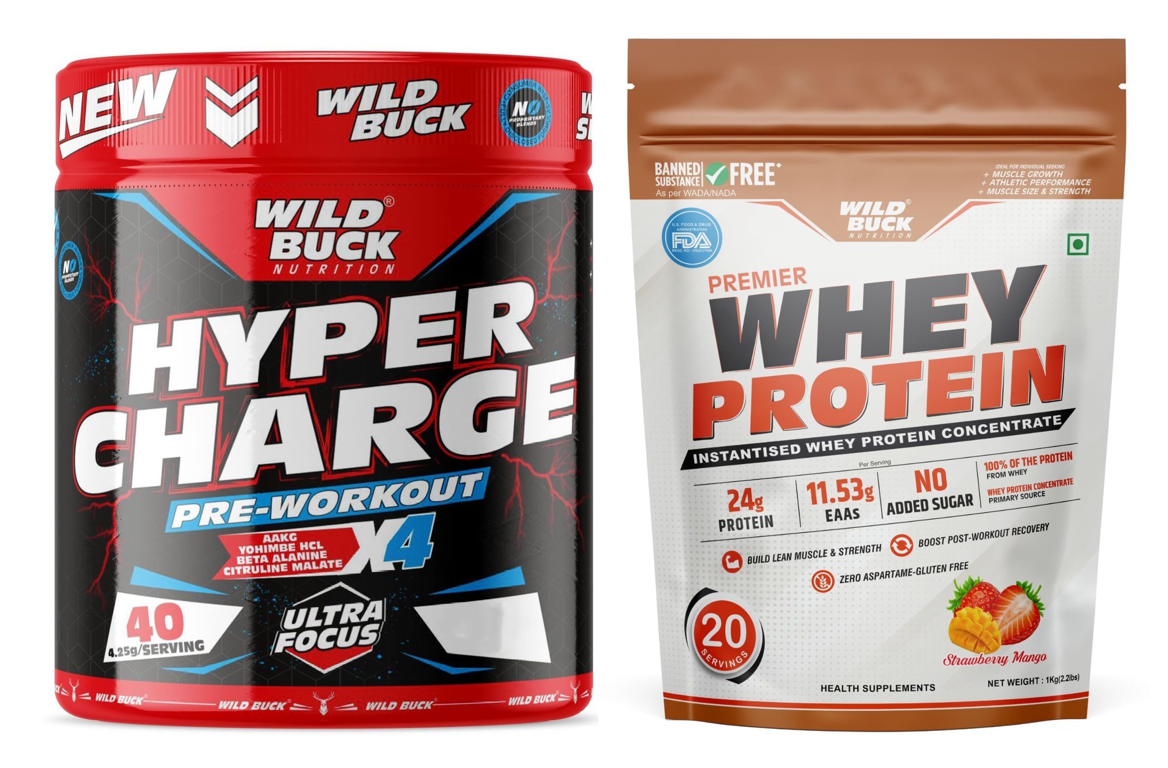 The WILD BUCK Hyper Charge X4 Pre-workout : Designed to elevate your energy focus power output and performance levels it will help you power through every training session and prime you for harder heavier and more productive lifts. With so many ingredients dedicated to powering up your results The WILD BUCK Pre-workout is in a league of its own. Stop leaving gains on the table. Start making the most of your workouts today with The WILD BUCK Pre-workout the lifting partner youâve been looking for. Serving: For Insane Workout - Take One Scoop with 150-200ml of water and drink 10-20 minutes before action. For Hardcore Workout - Take half Scoop with 150-200ml of water and drink 10-20 minutes before action. WILD BUCK Whey Protein is packed with Protein Glutamic Acid BCAA & Other EAAS. The primary source is whey protein concentrate which is loaded with health-boosting bioactive compounds along with natural phospholipids for quick recovery and sustained results.