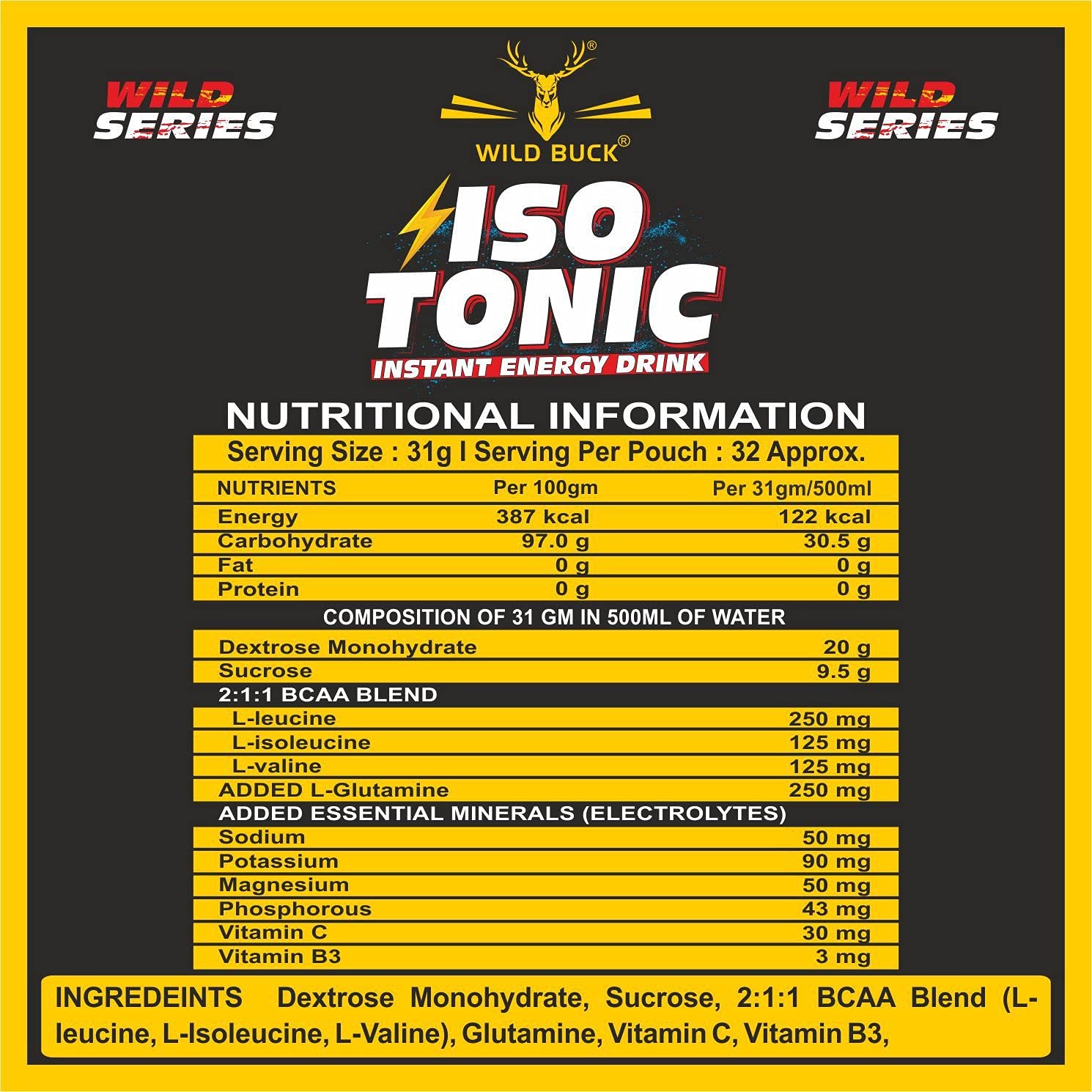 Bubbling with refreshing flavours each serving of Wild Buck Isotonic Instant Energy Formula helps to serve 833mg electrolyte that prevents cramps and renews energy