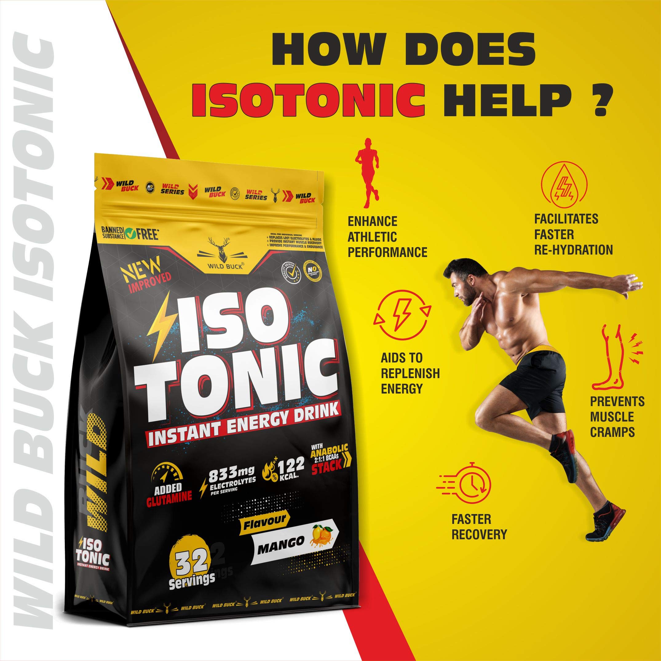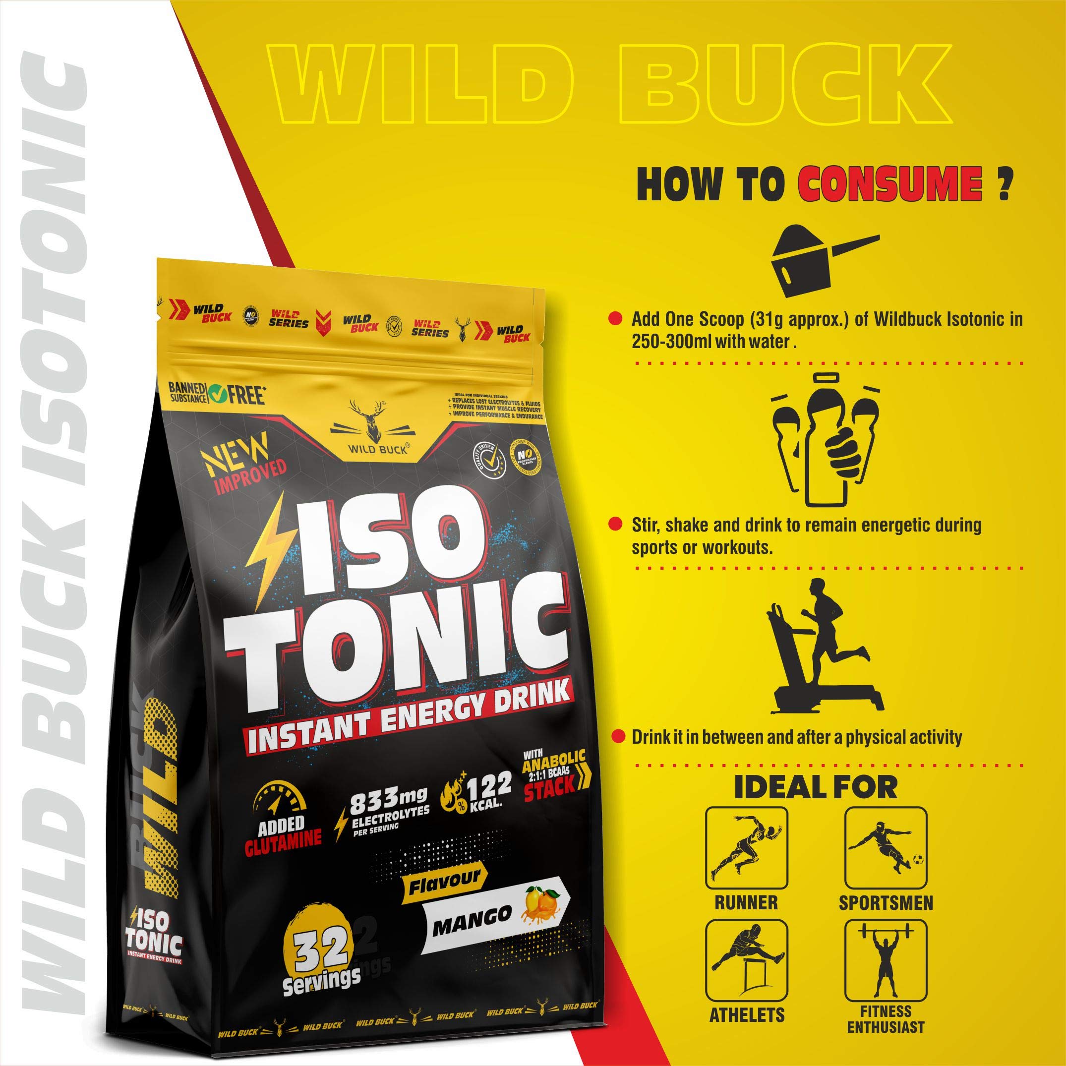 WILD BUCK Isotonic Instant Energy Drink Formula Workout Electrolyte Energy Drink With Anabolic Stack 2:1:1 Bcaa Dextrose Monohydrate And L-Glutamine | 833Mg Electrolytes [32 Servings Mango]