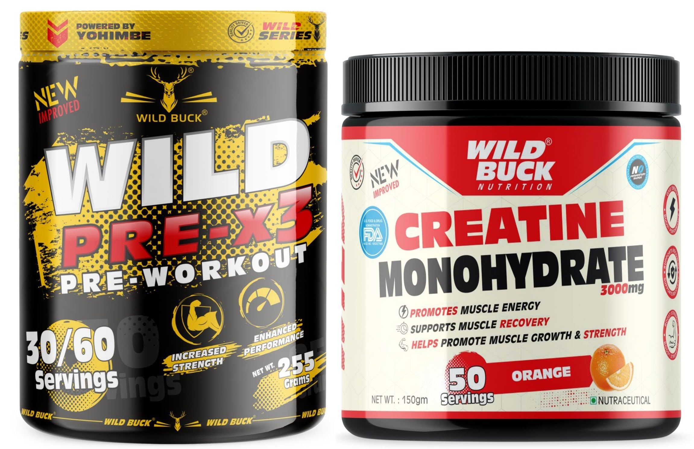 The WILD BUCK Pre-workout : Designed to elevate your energy focus power output and performance levels it will help you power through every training session and prime you for harder heavier and more productive lifts. With so many ingredients dedicated to powering up your results The WILD BUCK Pre-workout is in a league of its own. Stop leaving gains on the table. Start making the most of your workouts today with The WILD BUCK Pre-workout the lifting partner youâve been looking for. Serving: For Insane Workout - Take One Scoop with 150-200ml of water and drink 10-20 minutes before action. For Hardcore Workout - Take half Scoop with 150-200ml of water and drink 10-20 minutes before action. Creatine has become one of the most popular sports supplements among professional and amateur athletes. In the body creatine is converted to creatine phosphate which helps to fuel skeletal muscles and provides support for immediate energy products during high-intensity workouts. Creatine may very well be the single most heavily researched sports supplement available today. Creatine is a key nutrient that occurs naturally in the body and found in some foods. Creatine functions as an energy source in your muscle cells helping to increase strength and reduce fatigue during intense training.