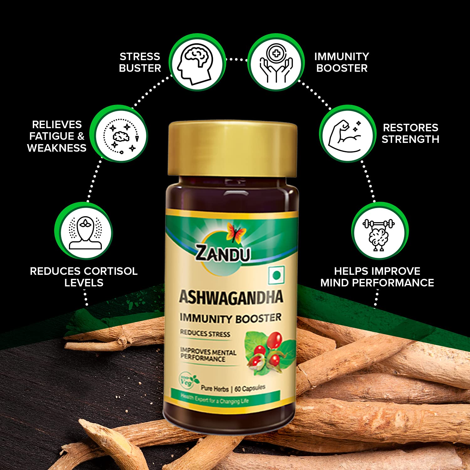 Zandu Ashwagandha Capsules are scientifically proven formula made with 100% pure extracts of the finest quality Ashwagandha with 2x Immunity. Unlike Ashwagandha churna these Ashwagandha Capsules are easy to take and helps you to relax by managing your stress levels after a strenuous day while relieving fatigue and weakness as well as restoring your natural body strength. Regular consumption of Ashwagandha Capsules can improve overall immunity.