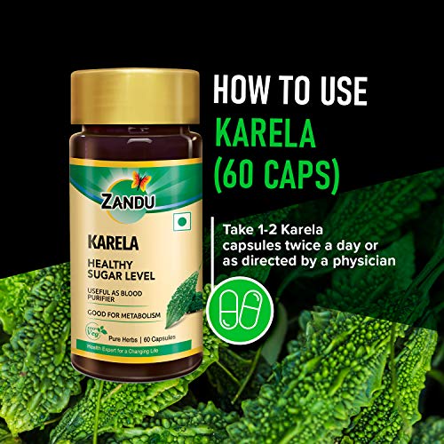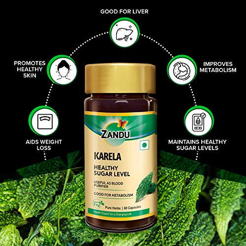 Zandu Karela Pure Herbs is formulated using natural extracts of karela or bitter gourd. Karela contains an insulin-like compound called polypeptide-p which effectively helps to control blood sugar levels naturally. Karela is also beneficial in keeping the skin clear and boosting metabolism.