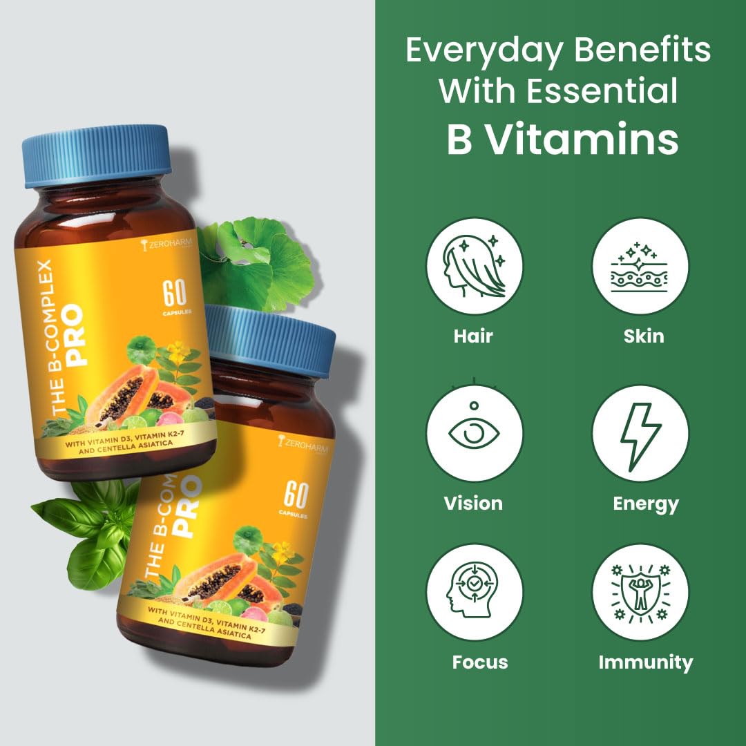 Zeroharm B-Complex Pro with Vitamin D3 & K2-7 | Vitamin B-Complex With B1 B2 B3 B5 B6 B9 & Vit B12 | Plant-Based Supplement | Supports Energy & Immunity For Men and Women | 60 Veg Capsules