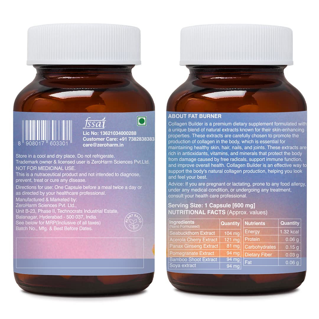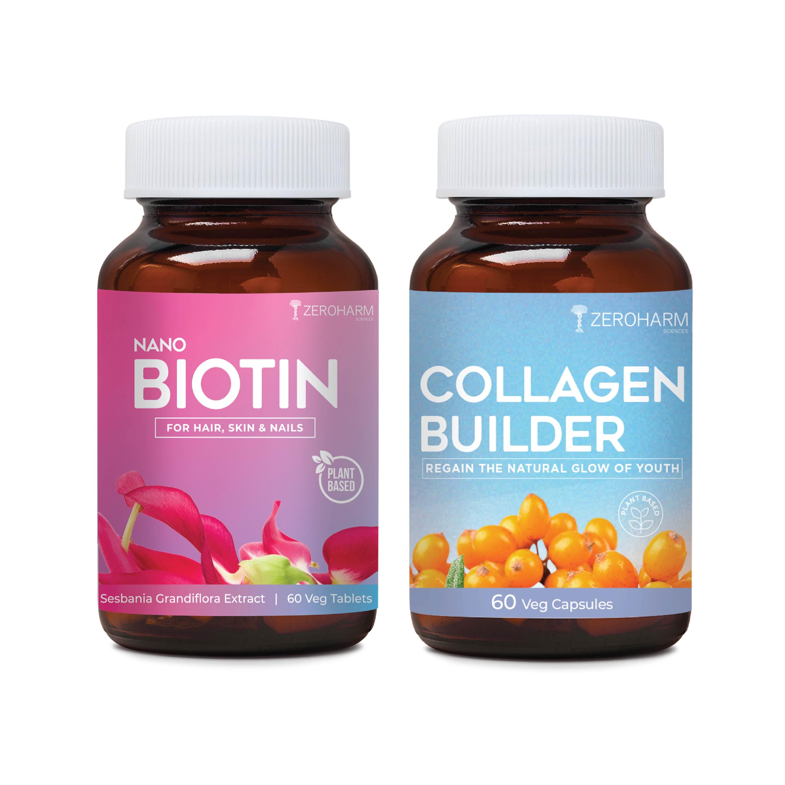 BIOTIN 30 MCG: ZeroHarm Nano Biotin comes with the goodness of Sesbania Grandiflora extract. Biotin a Vitamin B7 dietary supplement helps enhance the health of your hair skin and nails.â¯These plant-based tablets help improve hair growth thickness and volume. It stimulates keratin production to strengthen hair and reduce hair fall. Our patent-pending formulation process and nanotechnology ensure 100% Bioavailability and 90 times higher efficacy even with a much lower dosage. Collagen Builder: Zeroharm Collagen Builder is a precision nutraceutical that combines the power of Sea buckthorn extract Acerola extract Panax Ginseng root extract Bamboo shoot extract Pomegranate extract and Soya extract to help restore natural collagen levels reduce fine lines and wrinkles enhance skin glow improve skin elasticity hydrate skin enhance hair and nail health. Our patent-pending formulation process and nanotechnology ensure precision care with 90 times higher efficacy even with a much lower dosage.