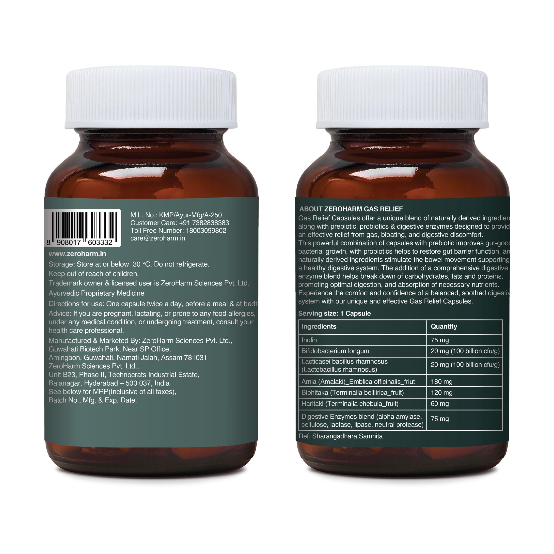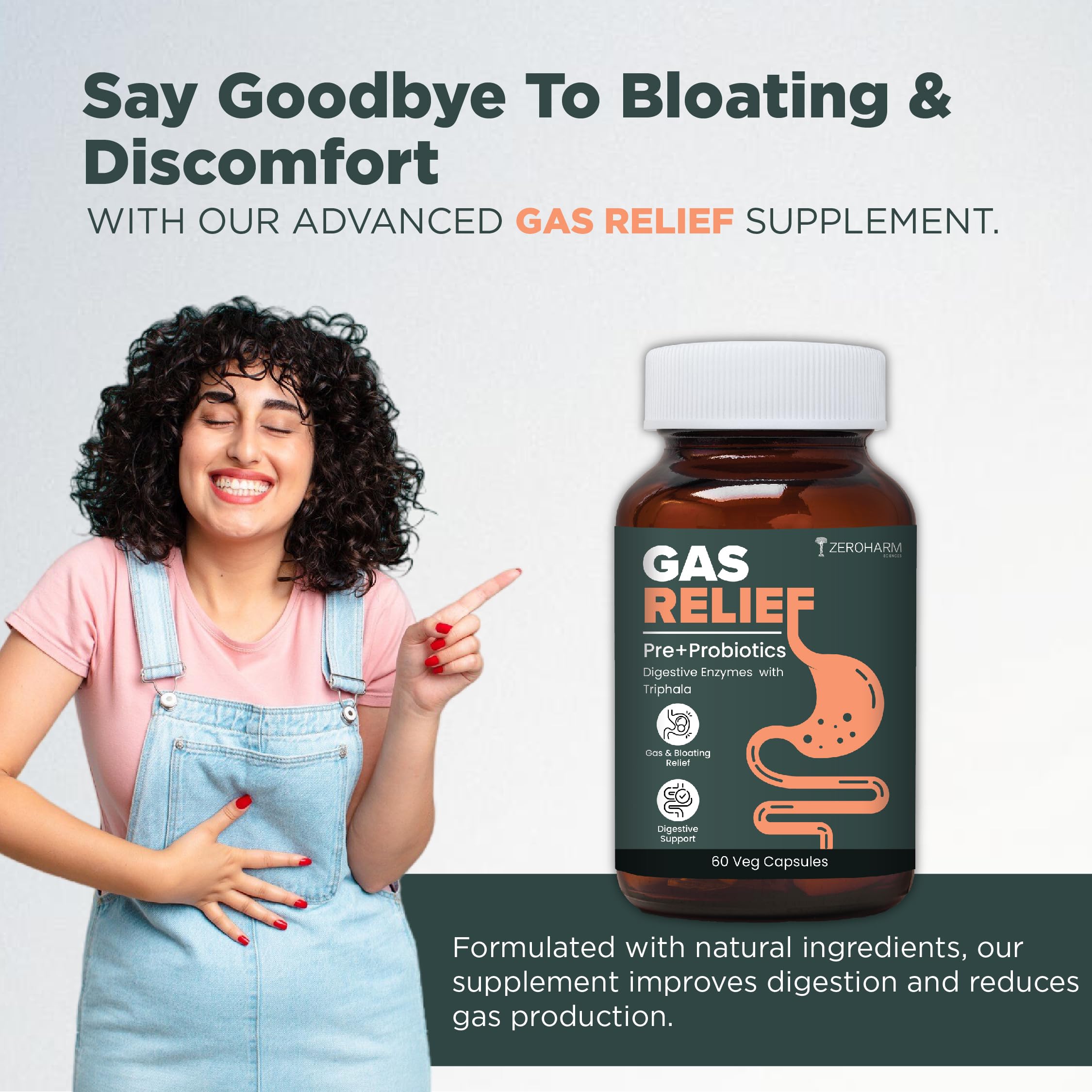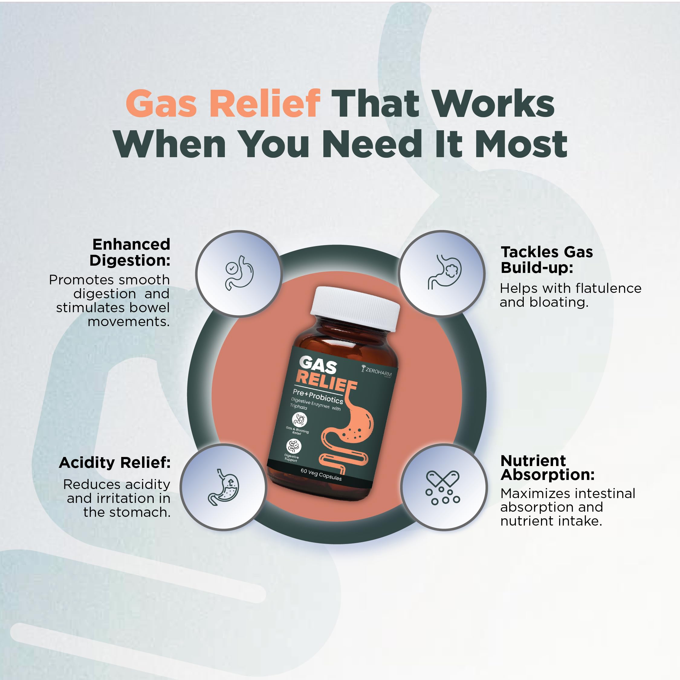 ZEROHARM Gas Relief Capsules | Helps in Reducing Acidity Recurrence With Digestive Enzymes Pre-Probiotics & Triphala | Reduces Bloating Flatulence & Enhances Digestion | 60 Capsules