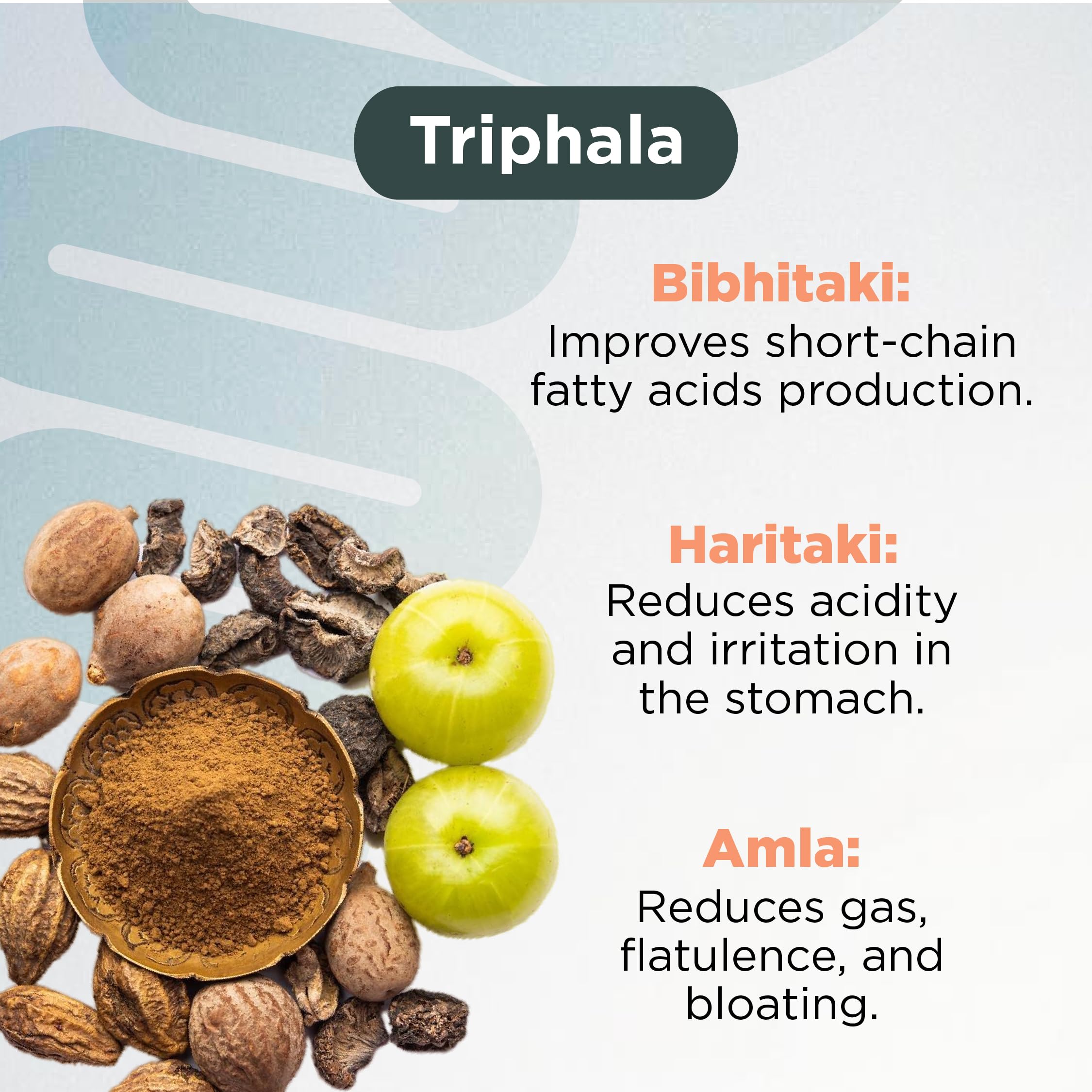 Acidity Relief: Triphala a blend of Amla Bibhitaka and Haritaki works to reduce acidity and irritation in the stomach. Its natural laxative and cooling properties help soothe the inner lining of the stomach reduce inflammation and encourage regular bowel