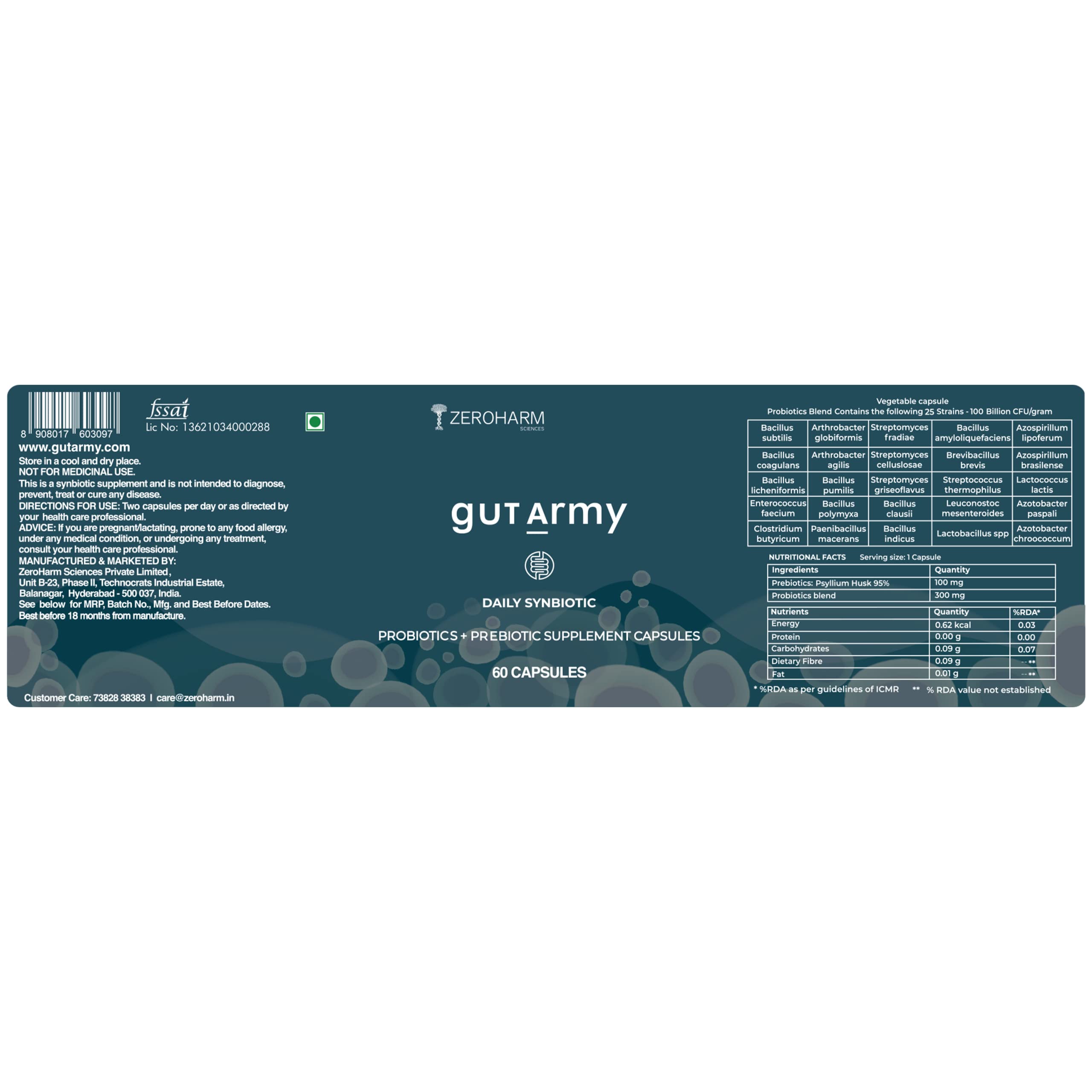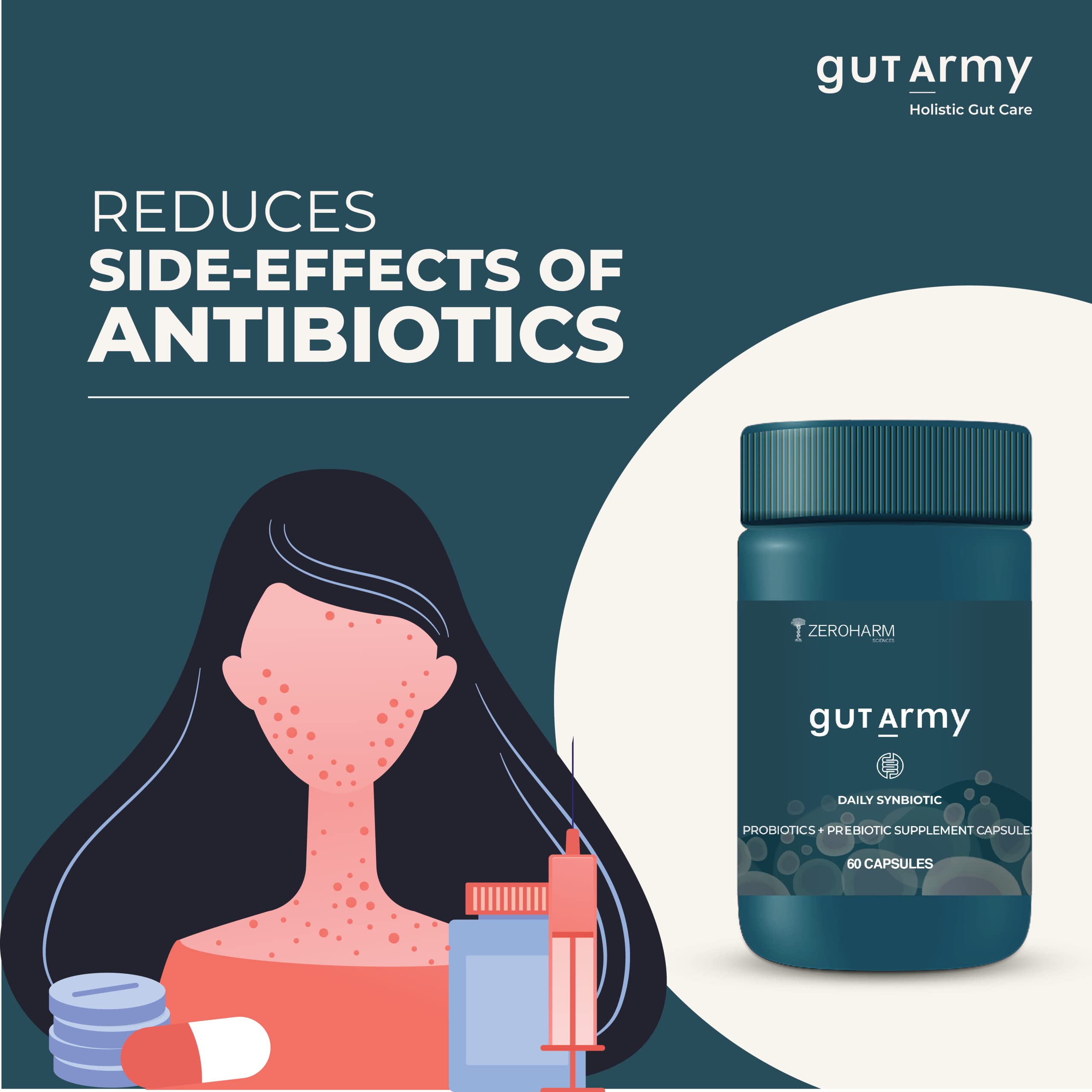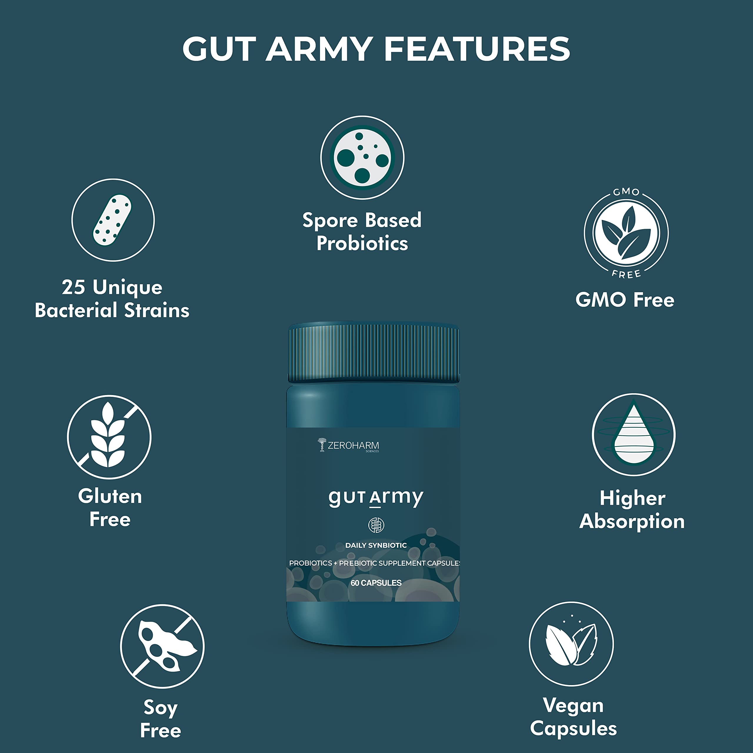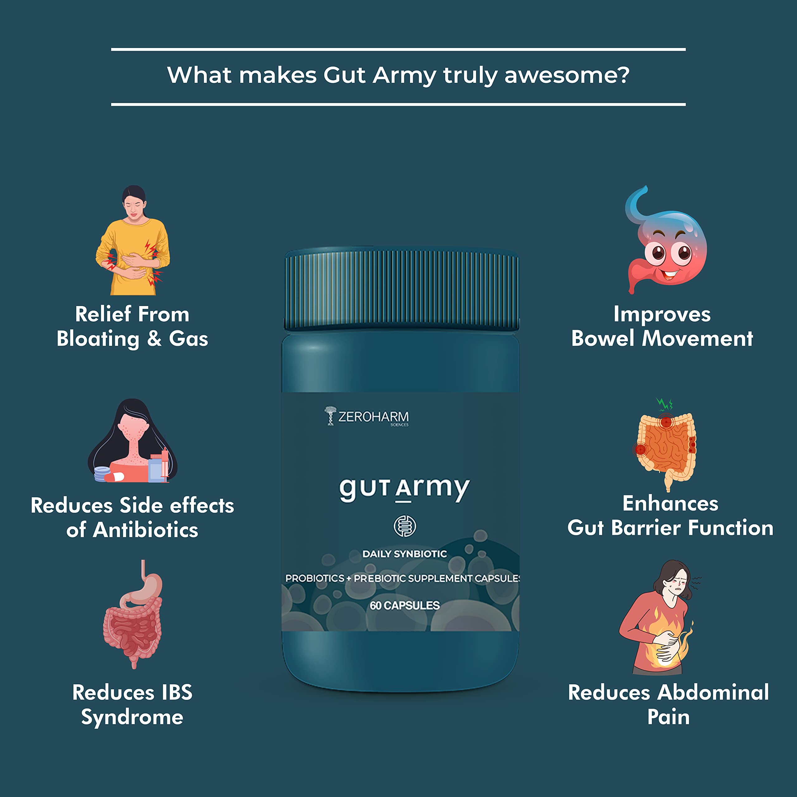 ZEROHARM Gut Army Probiotics Supplement for Men & Women -100 Billion CFU & 25 Strains | Gut Health Capsule for Gut Cleanser Digestion Acidity Relief Gastric Medicine IBS Symptoms -120 Vegan Tablet