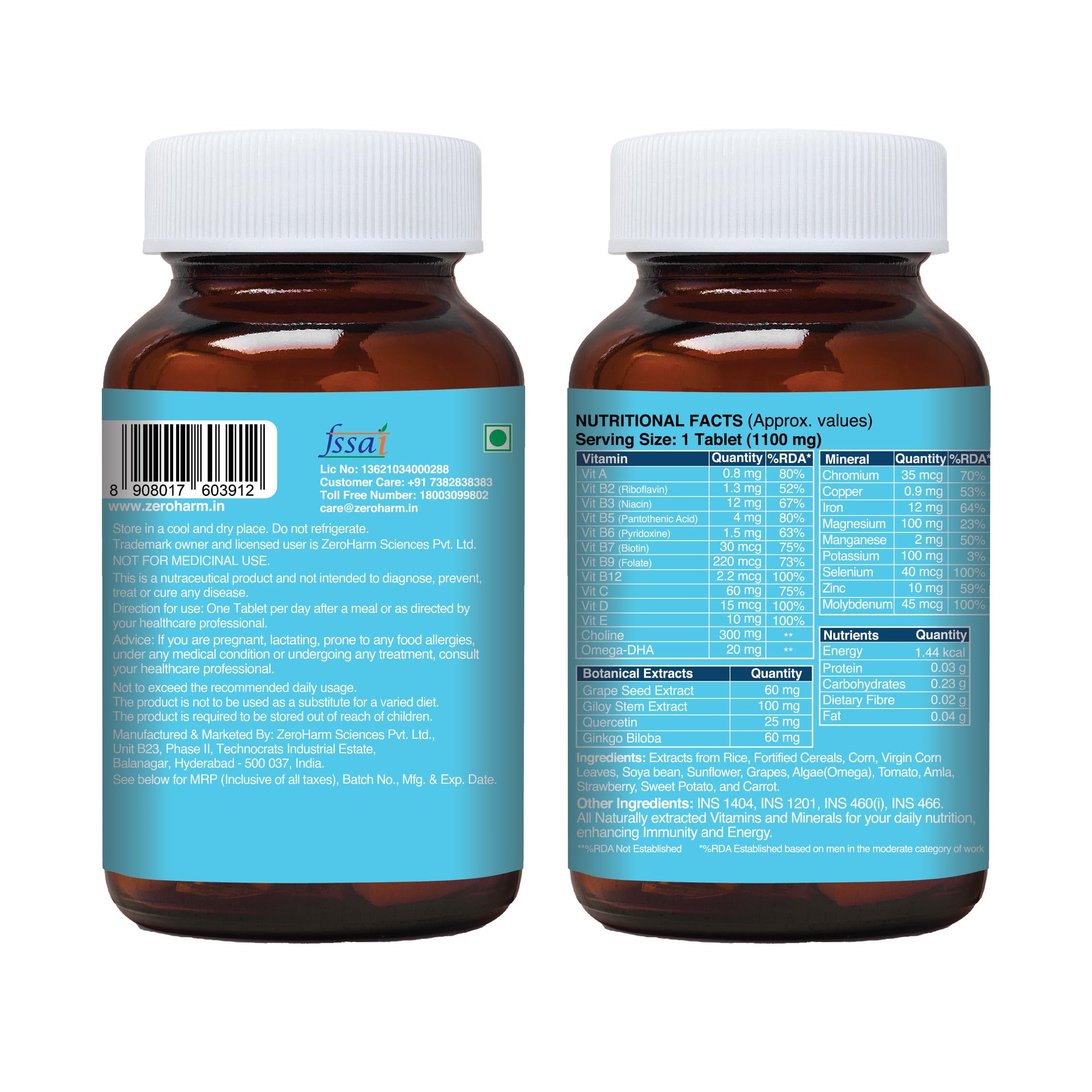 ZEROHARM Multivitamin Tablets for Men - Whole Food Multivitaminn With Essentail Vitamins A B C D E & Iron Zinc Magnesium - Daily Supplements for Immunity & Energy Support - 60 Veg Tablets