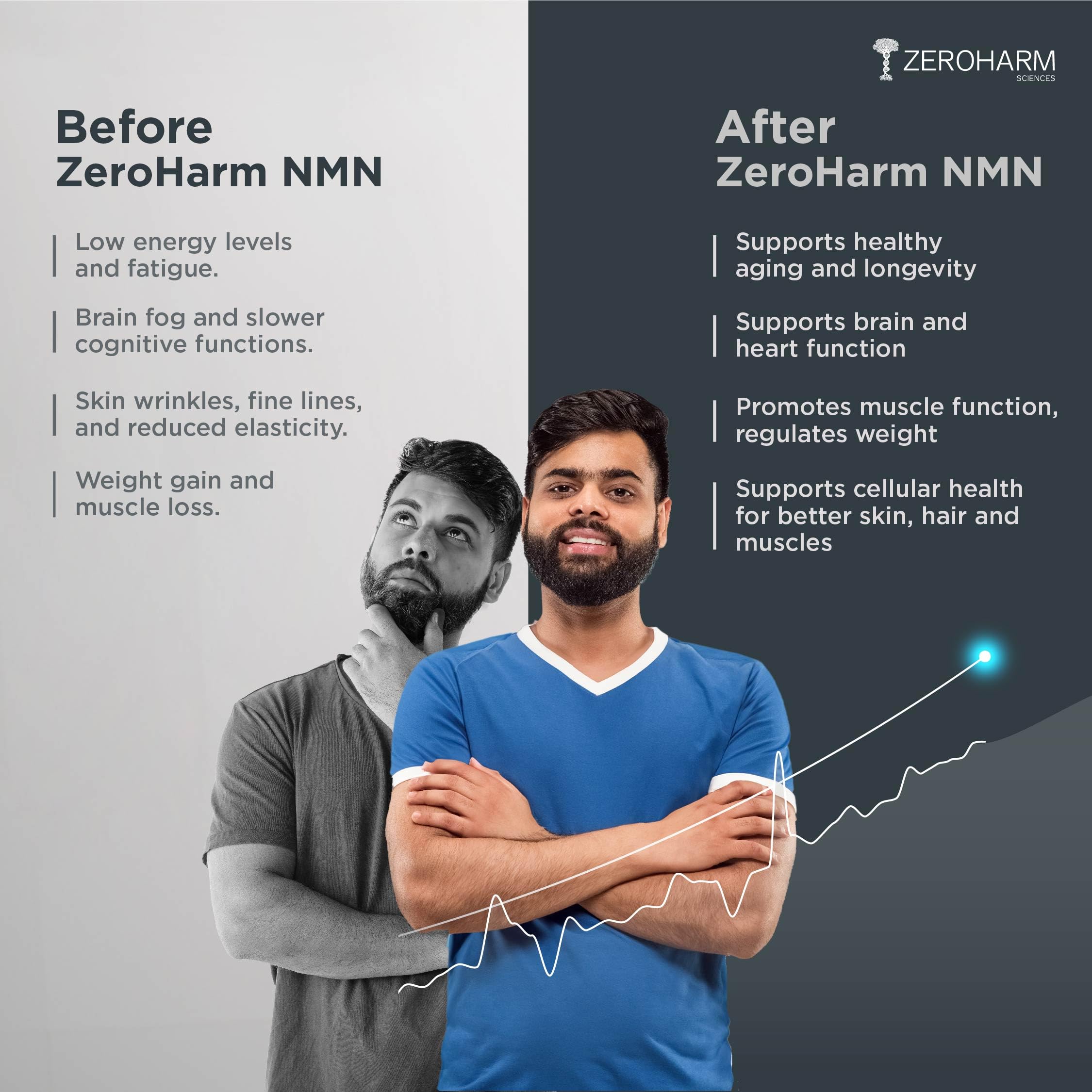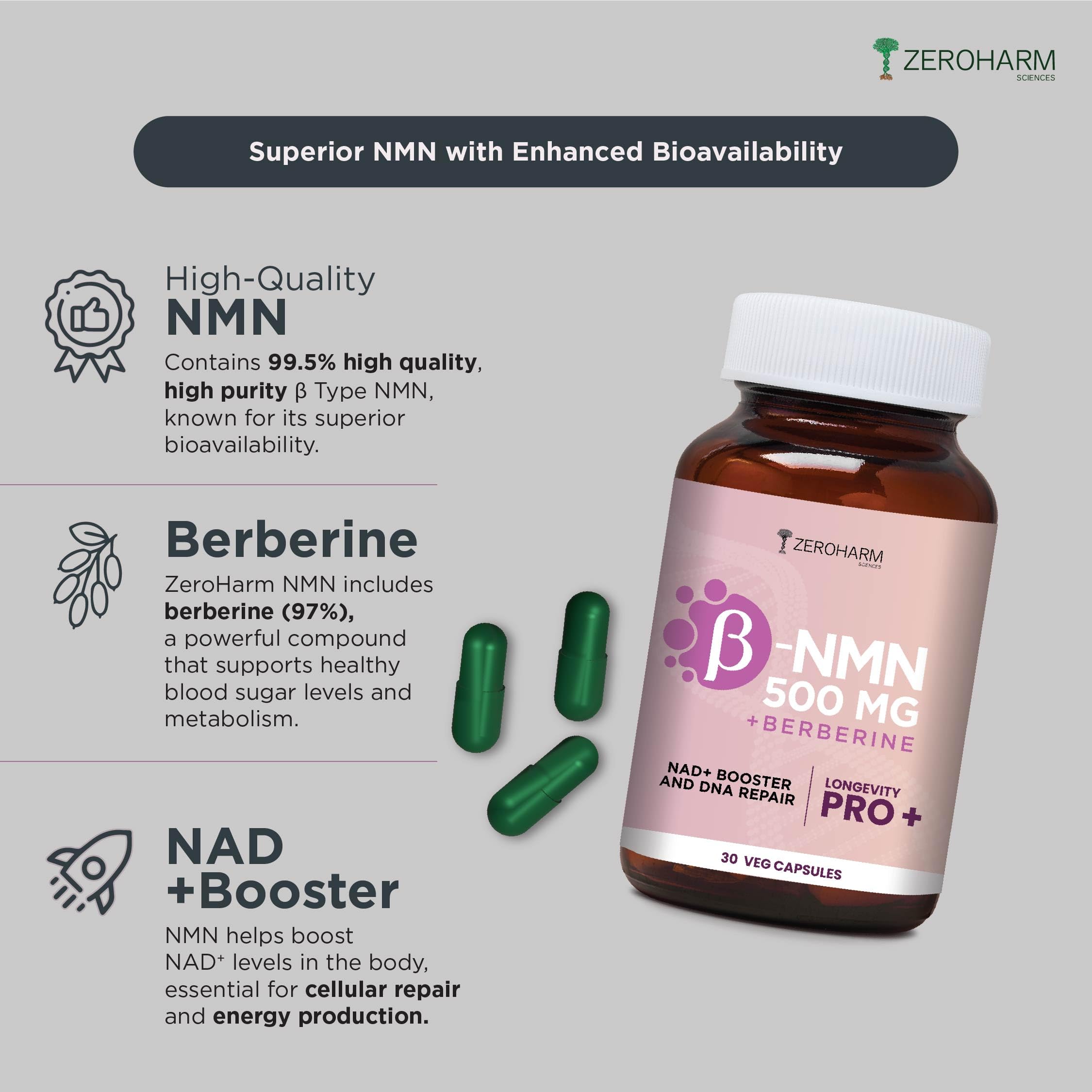 ZEROHARM NMN 500 MG + Berberine Capsules | Longevity Supplement | 99.5% Pure NMN | Boosts Energy Focus & Cellular Health | NAD+ Booster | 30 Veg Capsules | For Men & Women