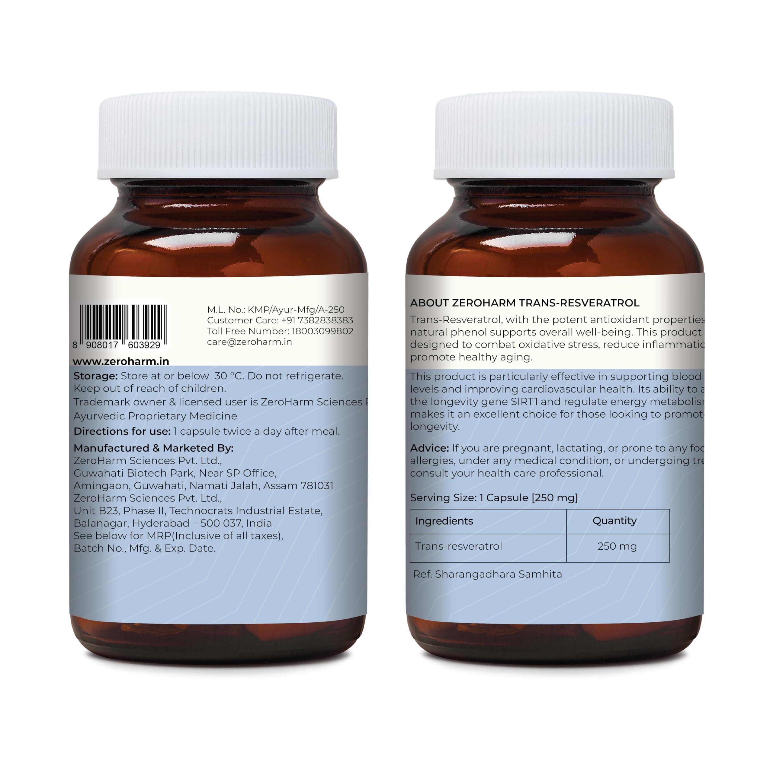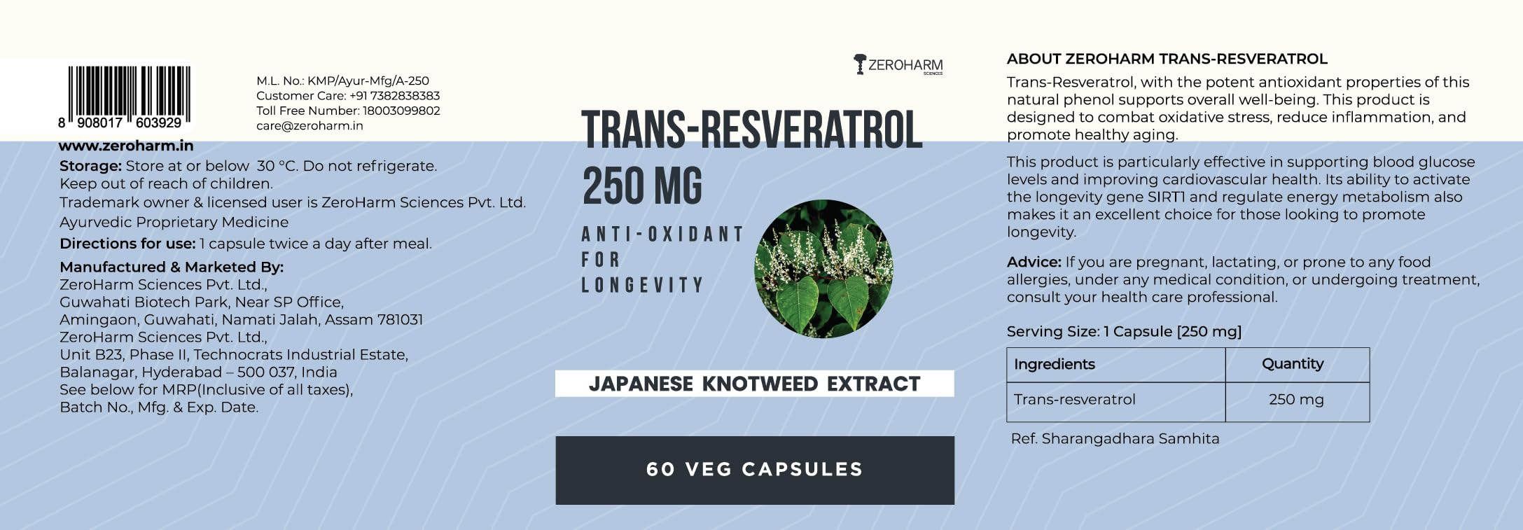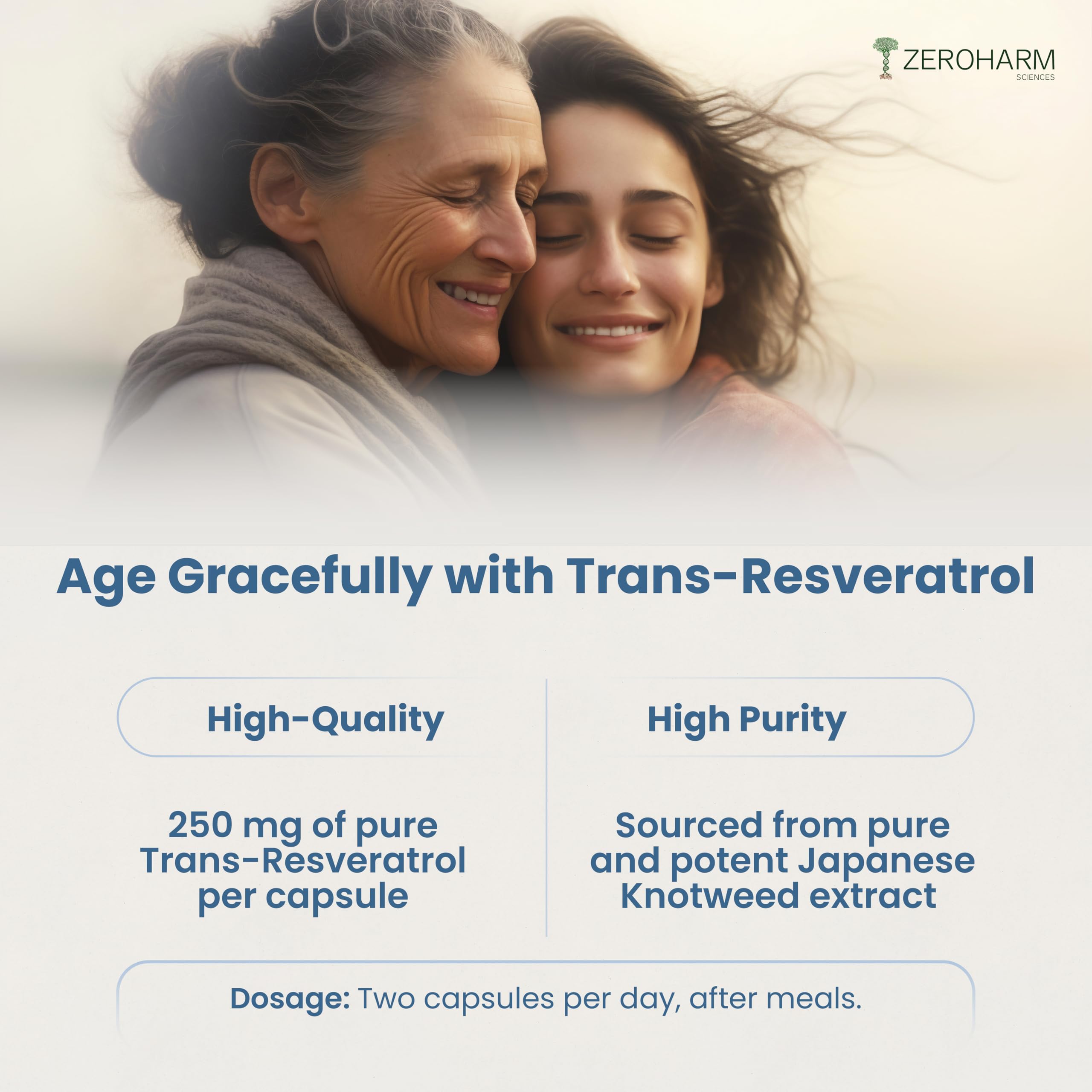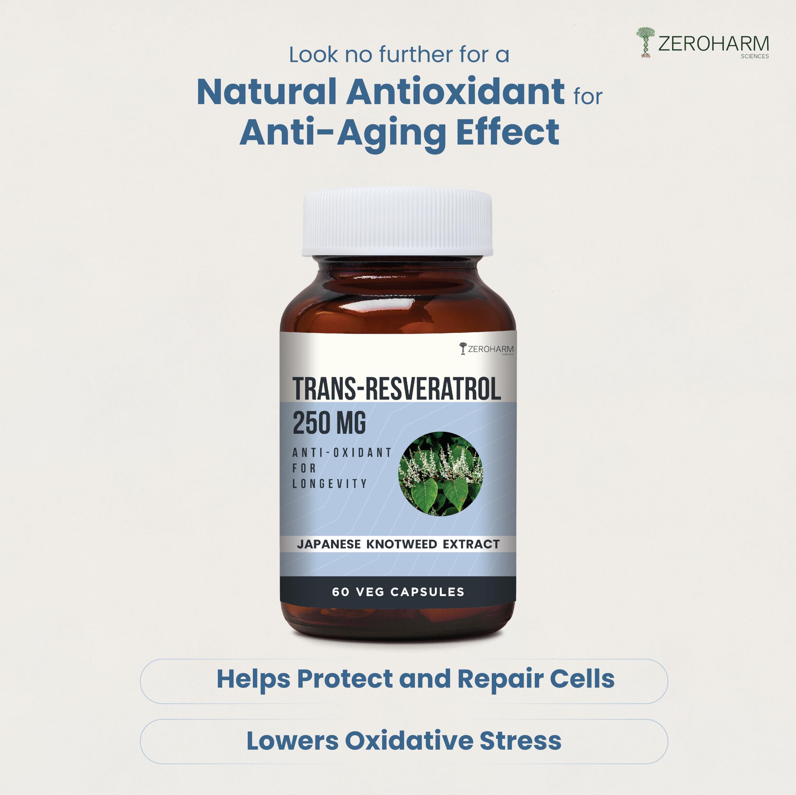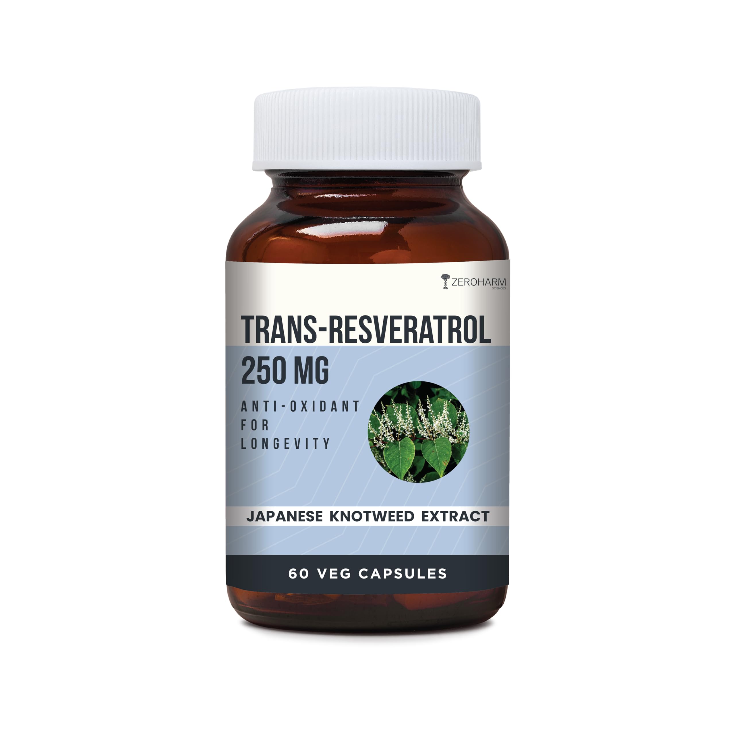 ZEROHARM Trans-Resveratrol Supplements | 250 mg Pure Resveratrol with Japanese Knotweed Extract - Support Immunity Support Healthy Aging | Antioxidant Supplement For Men & Women | 60 Veg Capsules