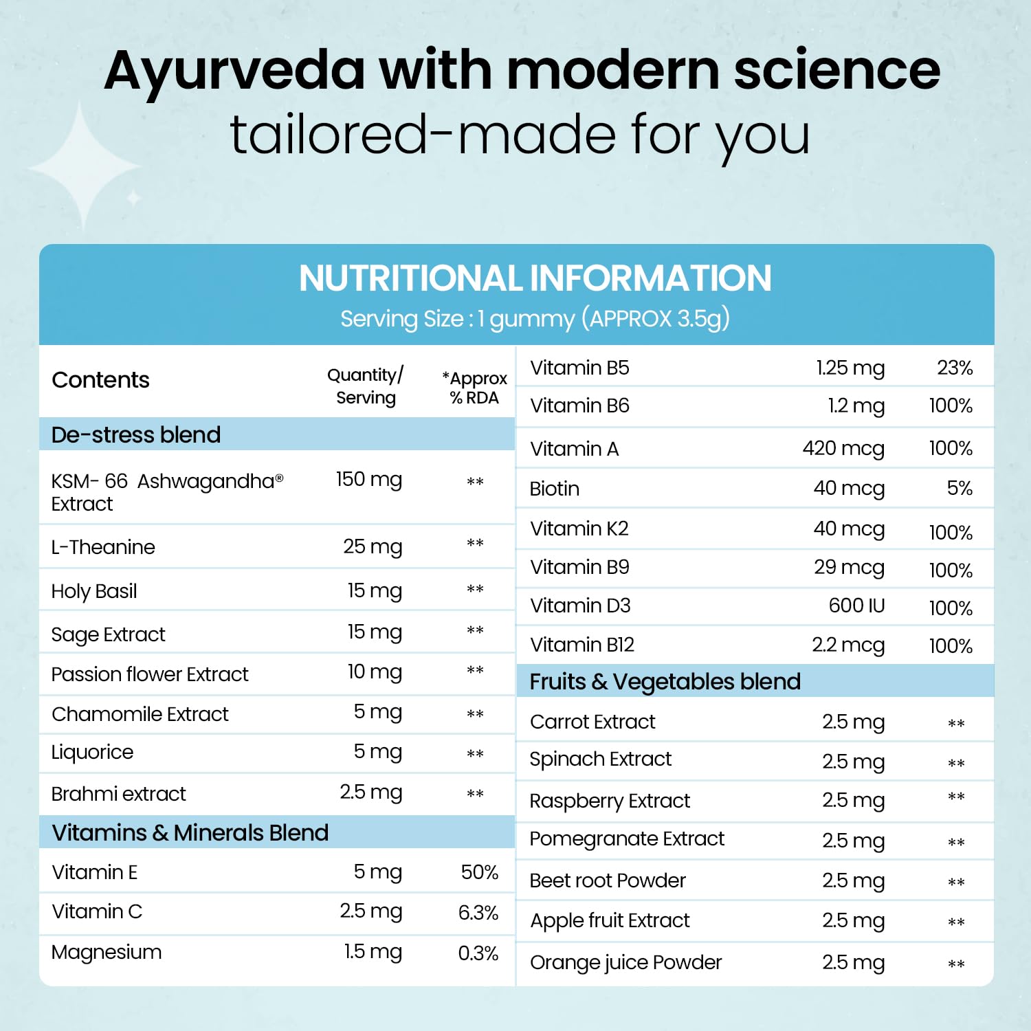 • Holistic Stress Management: De-Stress Gummies are specially formulated to promote a sense of calmness improve focus and boost energy levels. Crafted with a powerful blend of KSM-66 Ashwagandha L-Theanine and herbal extracts these gummies provide a moment
