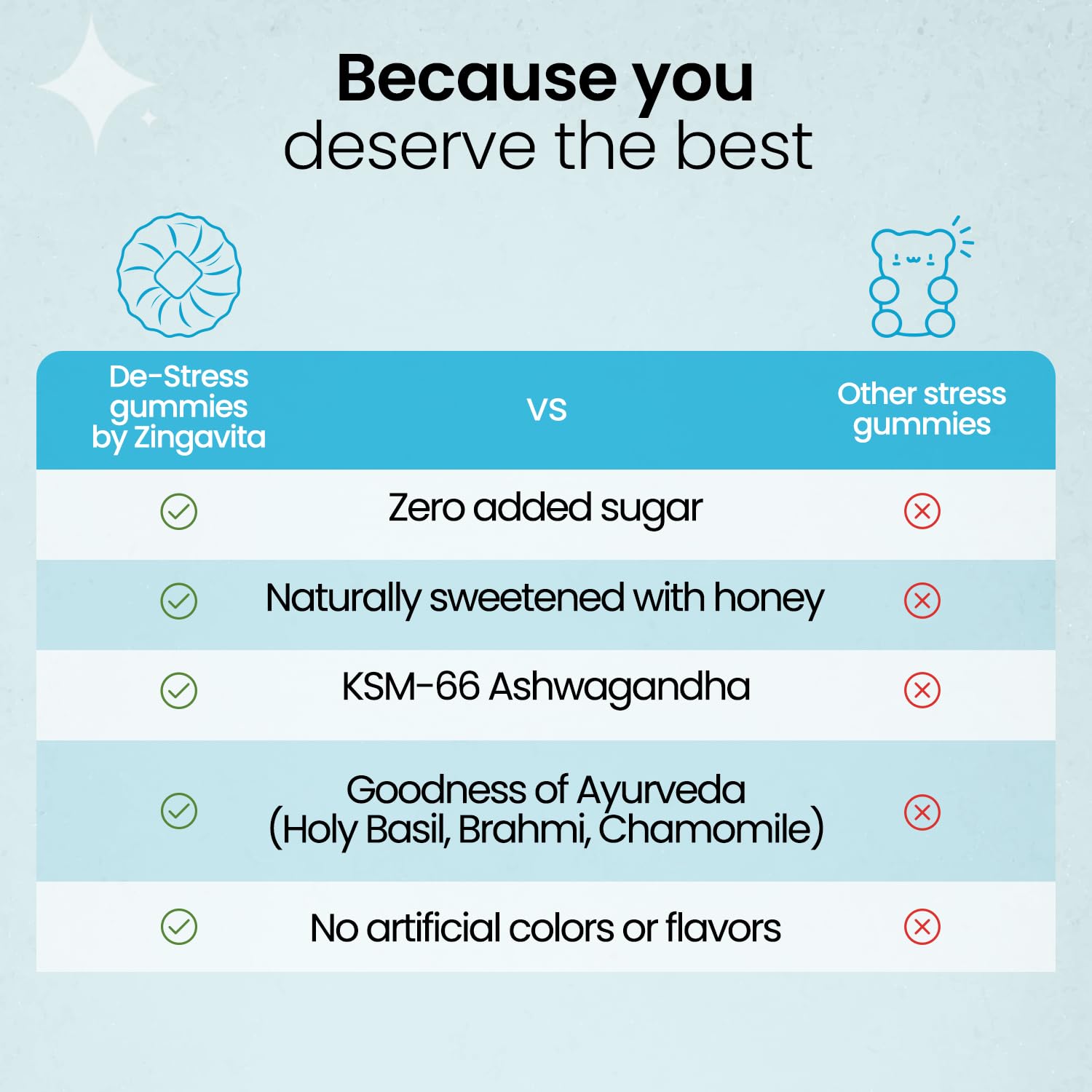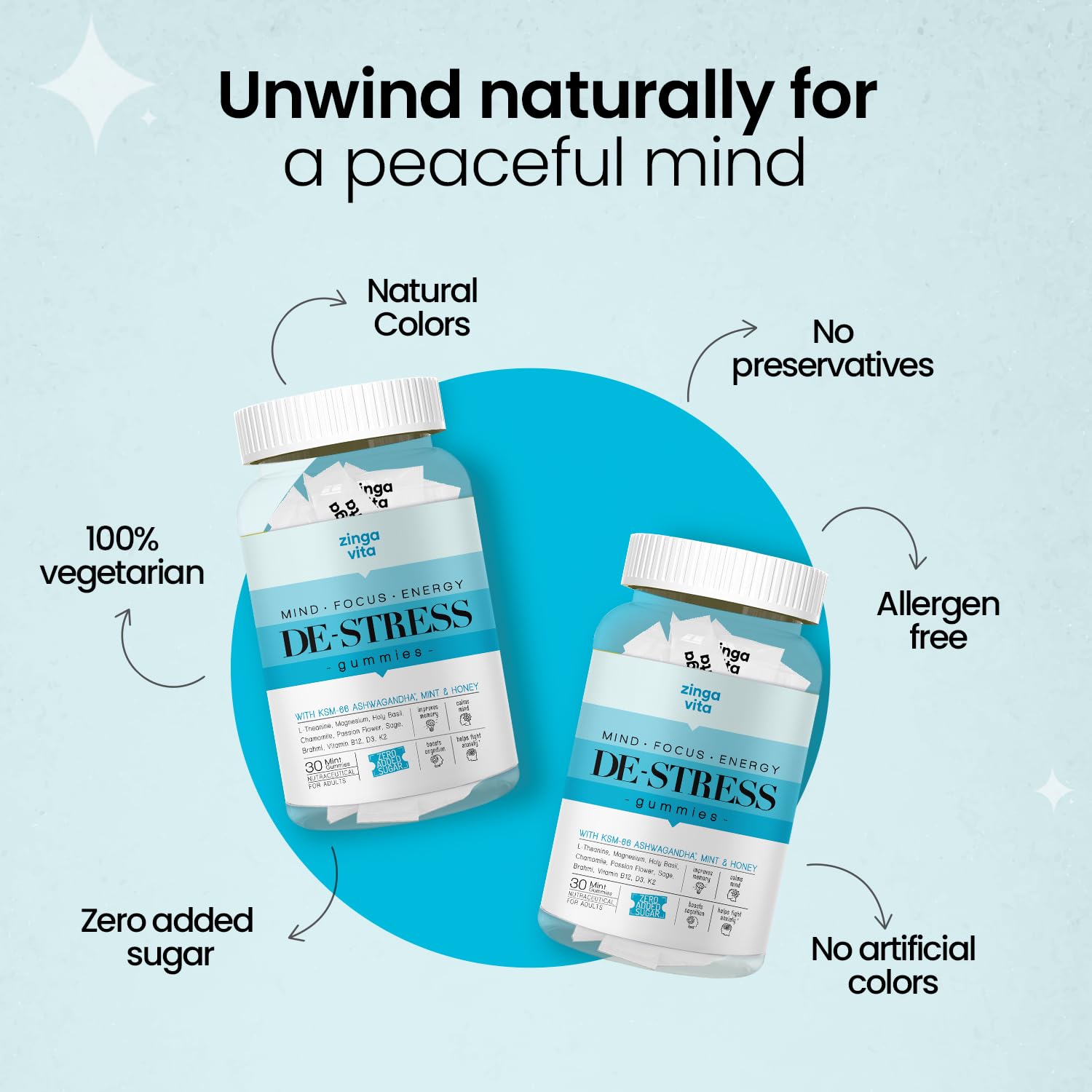 Destress gummies by zingavita contains natural ingredients, like ashwagandha ksm 66 which is clinically proven for destress. I have felt a difference, it makes me calm after my long workday.