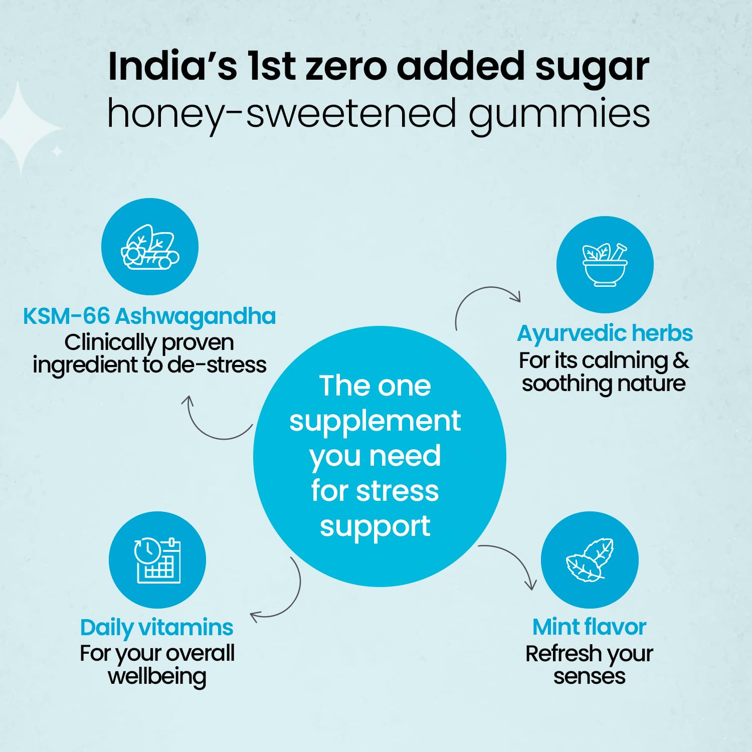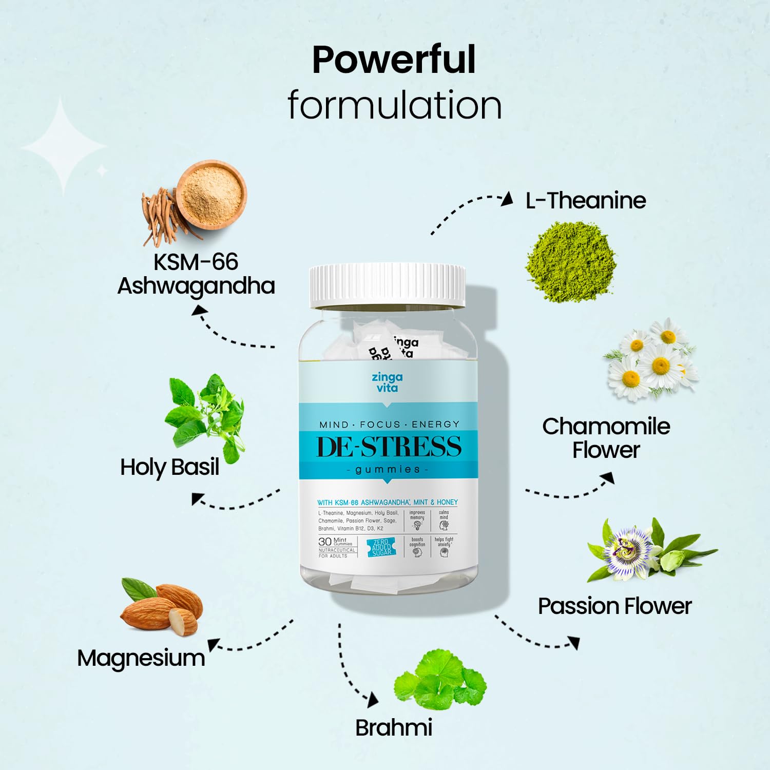Zingavita De-Stress Gummies with Honey KSM-66 Ashwagandha L-Theanine Holy Basil Chamomile & Sage extractsVitamin D3 B12 No Added Sugar Mint Flavour - 30 Gummies