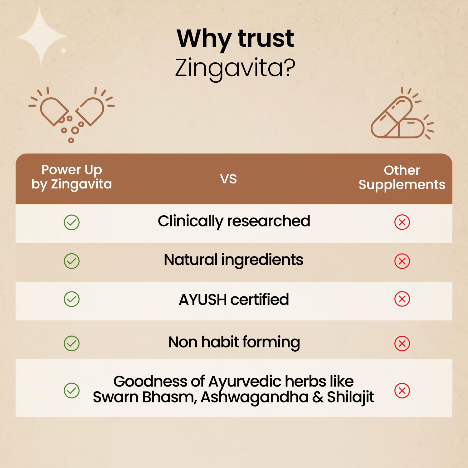 SAFE & EFFECTIVE Zingavita Ayurveda Power Up capsules are 100% vegan capsules certified by the Ministry of AYUSH with high quality ayurvedic ingredients