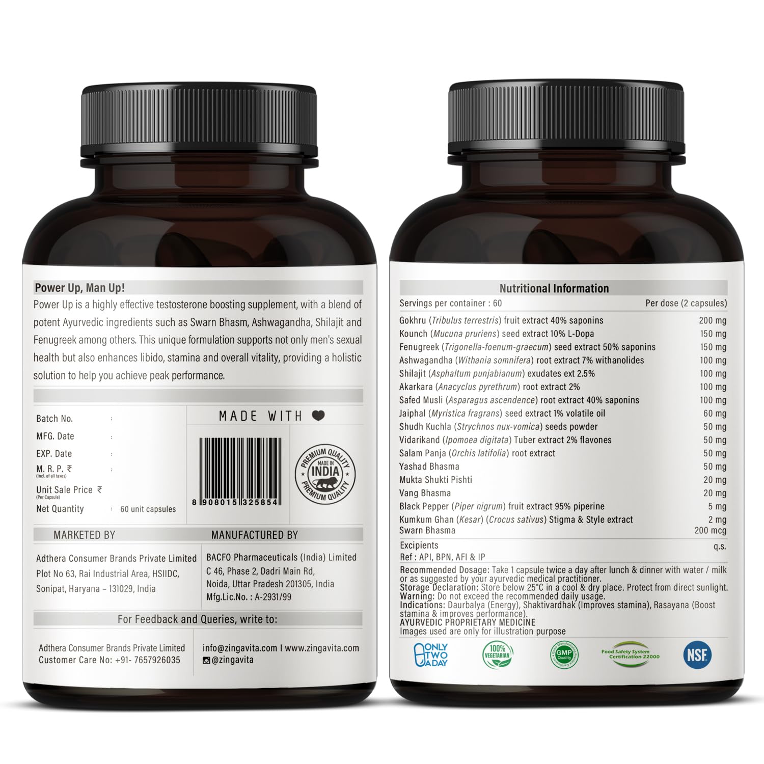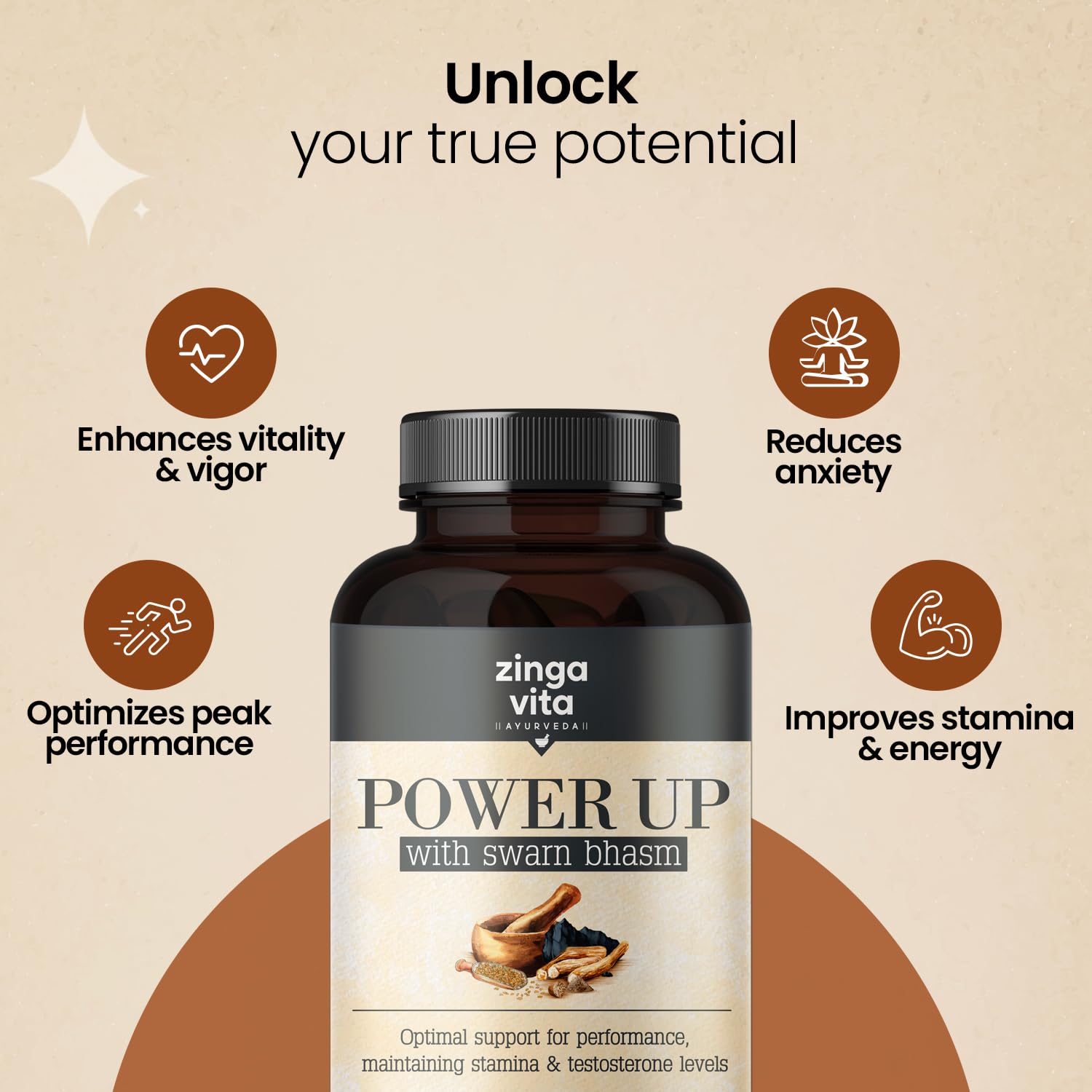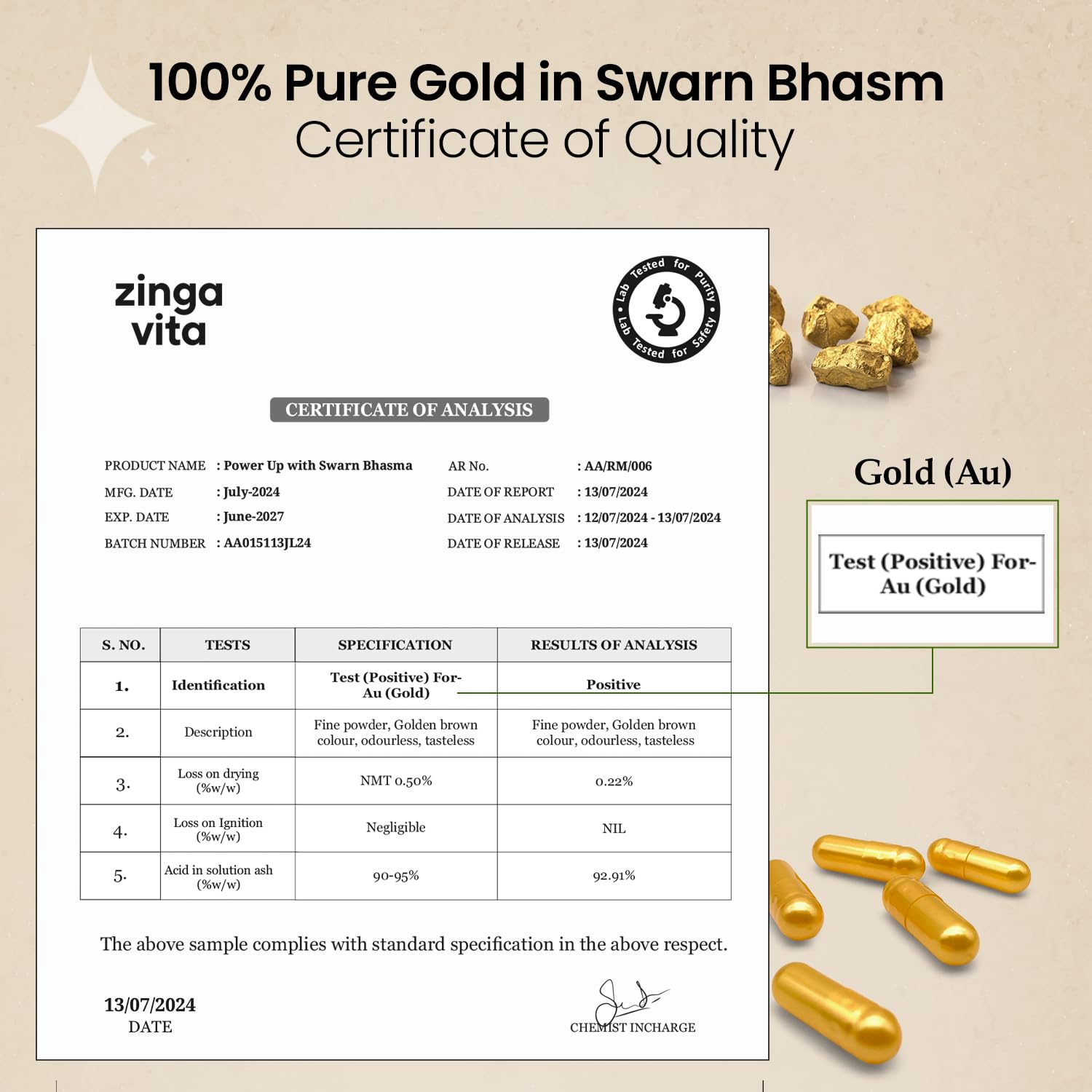 HELPS TO BOOST MUSCLE STRENGTH ENERGY AND VITALITY Reach your peak performance with Zingavita Ayurveda Power Up Gold capsules. Packed with 50mg Yashad Bhasma 20mg Vang Bhasma 50mg Vidarikand and 200mcg Swarna Bhasma it helps in strong stamina boost.