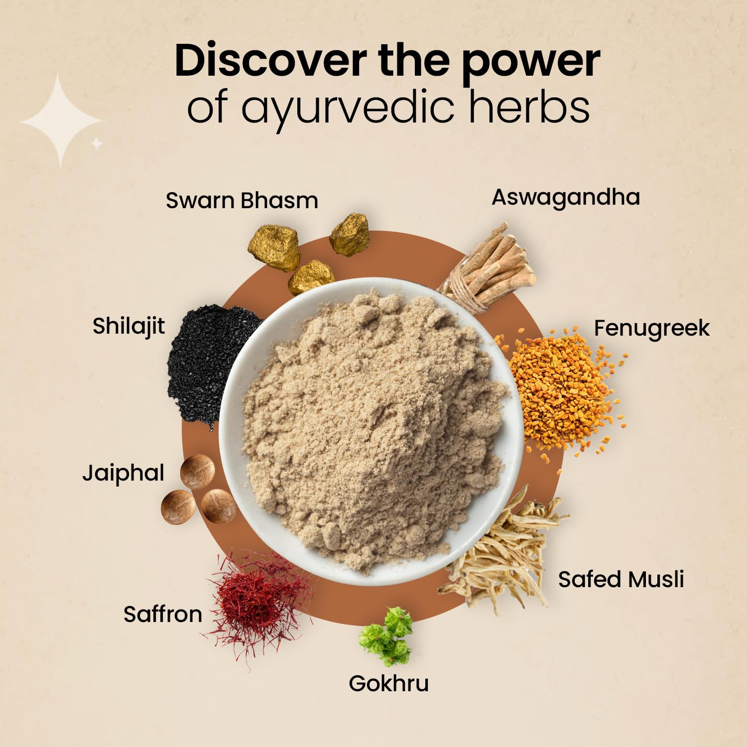 NATURAL INGREDIENTS Our ayurvedic supplement is packed with AYUSH approved herbs like Swarn Bhasma Shilajit Ashwagandha Safed Musli Gokshura Fenugreek and Kounch. These ingredients are known for their benefits to help in muscle strength growth and recover